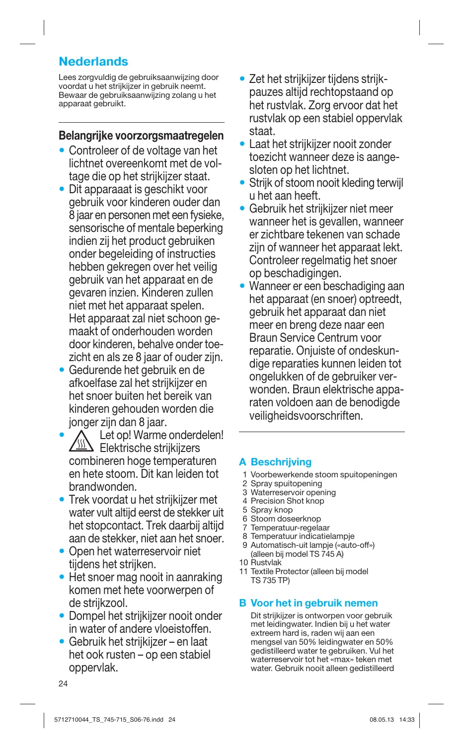 Voorbewerkende stoom spuitopeningen Spray spuitopening Waterreservoir opening Precision Shot knop Spray knop Stoom doseerknop Temperatuur-regelaar Temperatuur indicatielampje Automatisch-uit lampje («auto-off») (alleen bij model TS 745 A) 10 Rustvlak 11 Textile Protector (alleen bij model TS 735 TP) B Voor het in gebruik nemen Dit strijkijzer is ontworpen voor gebruik met leidingwater. Indien bij u het water extreem hard is, raden wij aan een mengsel van 50% leidingwater en 50% gedistilleerd water te gebruiken. Vul het waterreservoir tot het «max» teken met water. Gebruik nooit alleen gedistilleerd
