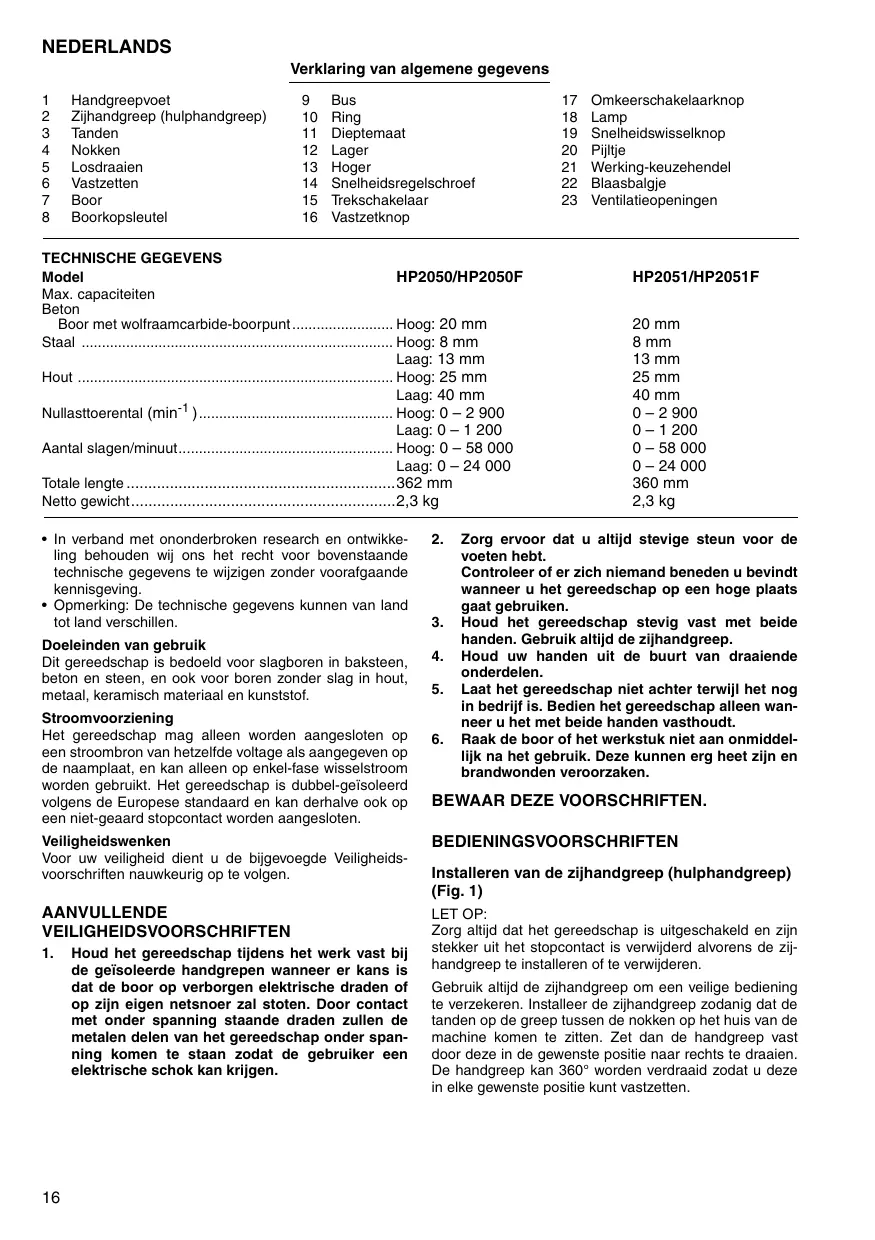 Omkeerschakelaarknop Lamp Snelheidswisselknop Pijltje Werking-keuzehendel Blaasbalgje Ventilatieopeningen HP2051/HP2051F 20 mm 8 mm 13 mm 25 mm 40 mm 0 – 2 900 0 – 1 200 0 – 58 000 0 – 24 000 360 mm 2,3 kg Zorg ervoor dat u altijd stevige steun voor de voeten hebt. Controleer of er zich niemand beneden u bevindt wanneer u het gereedschap op een hoge plaats gaat gebruiken. Houd het gereedschap stevig vast met beide handen. Gebruik altijd de zijhandgreep. Houd uw handen uit de buurt van draaiende onderdelen. Laat het gereedschap niet achter terwijl het nog in bedrijf is. Bedien het gereedschap alleen wanneer u het met beide handen vasthoudt. Raak de boor of het werkstuk niet aan onmiddellijk na het gebruik. Deze kunnen erg heet zijn en brandwonden veroorzaken. BEWAAR DEZE VOORSCHRIFTEN. Veiligheidswenken Voor uw veiligheid dient u de bijgevoegde Veiligheidsvoorschriften nauwkeurig op te volgen. BEDIENINGSVOORSCHRIFTEN AANVULLENDE VEILIGHEIDSVOORSCHRIFTEN LET OP: Zorg altijd dat het gereedschap is uitgeschakeld en zijn stekker uit het stopcontact is verwijderd alvorens de zijhandgreep te installeren of te verwijderen.