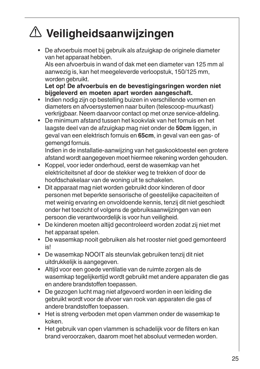 Dans le cas où il existe déjà un tuyau d’évacuation de l’air d’un diamètre de 125 mm dans le mur ou sur le toit, on pourra utiliser le manchon de réduction 150/125 mm. Le bruit de fonctionnement sera un peu plus élevé. Attention ! Le tuyau d’évacuation et les colliers de fixation ne sont pas fournis et doivent être achetés à part. • La distance minimum entre la superficie de support des récipients sur le dispositif de cuisson et la partie la plus basse de la hotte de cuisine ne doit pas être inférieure à 50cm dans le cas de cuisinières électriques et de 65cm dans le cas de cuisinières à gaz ou mixtes. Si les instructions d’installation du dispositif de cuisson au gaz spécifient une plus grande distance, il faut en tenir compte. • Avant toute opération de nettoyage ou d’entretien, débrancher la hotte du circuit électrique en retirant la prise ou en coupant l’interrupteur général de l’habitation. • L’appareil n’est pas destiné à une utilisation par des enfants ou des personnes à capacités physiques, sensorielles ou mentales réduites et sans expérience et connaissance à moins qu’ils ne soient sous la supervision ou formés sur l’utilisation de l’appareil par une personne responsable de leur sécurité. • Les enfants doivent être surveillés afin qu’ils ne jouent pas avec l’appareil. • Ne jamais utiliser la hotte sans que la grille ne soit montée correctement! • La hotte ne doit JAMAIS être utilisée comme plan pour déposer quelque chose sauf si cela est expressément indiqué. • Quand la hotte est utilisée en même temps que d’autres appareils à combustion de gaz ou d’autres combustibles, le local doit disposer d’une ventilation suffisante. • L’air aspiré ne doit jamais être envoyé dans un conduit utilisé pour l’évacuation des fumées produites par des appareils à combustion de gaz ou d’autres combustibles. • Il est formellement interdit de faire flamber les aliments sous la hotte. • L’utilisation de flammes libres peut entraîner des dégâts aux filtres et peut donner lieu à des incendies, il faut donc les éviter à tout prix. 45