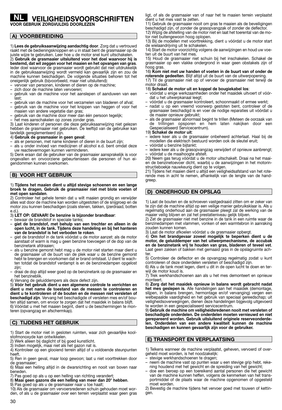 NL VEILIGHEIDSVOORSCHRIFTEN VOOR GEBRUIK ZORGVULDIG DOORLEZEN A) VOORBEREIDING 1) Lees de gebruiksaanwijzing aandachtig door. Zorg dat u vertrouwd raakt met de bedieningsknoppen en u in staat bent de grasmaaier op de juiste wijze te gebruiken. Leer hoe u de motor snel kunt uitschakelen. 2) Gebruik de grasmaaier uitsluitend voor het doel waarvoor hij is bestemd, dat wil zeggen voor het maaien en het opvangen van gras. Ieder doel waarvoor de grasmaaier wordt gebruikt dat niet uitdrukkelijk in de gebruiksaanwijzing wordt vermeld kan gevaarlijk zijn en zou de machine kunnen beschadigen. De volgende situaties behoren tot het oneigenlijk gebruik (bijvoorbeeld, maar niet uitsluitend): – vervoer van personen, kinderen of dieren op de machine; – zich door de machine laten vervoeren; – gebruik van de machine voor het aanslepen of aanduwen van een last; – gebruik van de machine voor het verzamelen van bladeren of afval; – gebruik van de machine voor het knippen van heggen of voor het maaien van andere vegetatie dan gras; – gebruik van de machine door meer dan één persoon tegelijk; – het mes aanschakelen op zones zonder gras. 3) Laat kinderen of personen die deze gebruiksaanwijzing niet gelezen hebben de grasmaaier niet gebruiken. De leeftijd van de gebruiker kan landelijk gereglementeerd zijn. 4) Gebruik de grasmaaier in geen geval: – als er personen, met name kinderen of dieren in de buurt zijn; – als u onder invloed van medicijnen of alcohol e.d. bent omdat deze uw reactievermogen kunnen verminderen. 5) Denk eraan dat de gebruiker van de grasmaaier aansprakelijk is voor ongevallen en onvoorziene gebeurtenissen die personen of hun eigendommen kunnen overkomen.