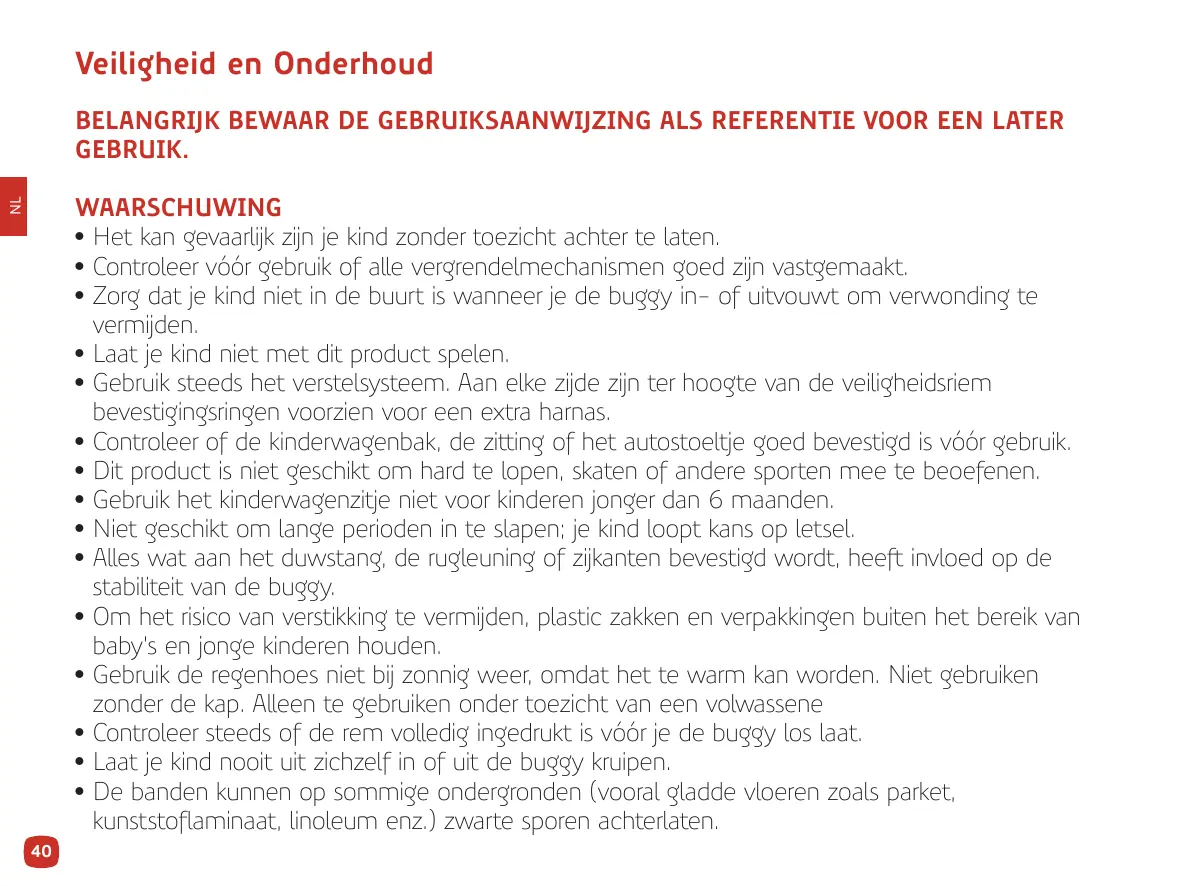 3. Ne soulevez jamais la poussette lorsque votre enfant y est installé. 4. Si le fabricant de votre poussette recommande une utilisation en combinaison avec une nacelle ou siège auto, dans ce cas, le poids maximum d’utilisation de la combinaison est celui indiqué sur le produit additionnel. 5. Si le fabricant de votre poussette recommande une utilisation en combinaison avec une nacelle ou un siège auto, placez-les toujours face à vous. 6. N’empruntez jamais d’escaliers ou escalators avec votre enfant dans la poussette. 7. Utilisez toujours le frein lorsque la poussette est immobile, même si vous ne vous arrêtez qu’un instant! Le frein doit toujours être enclenché lors de l’installation et de l’enlèvement de l’enfant. 8. N’utilisez que des accessoires ou pièces de rechanges vendus et approuvés par le fabricant. L’utilisation d’autres accessoires peut s’avérer dangereuse.