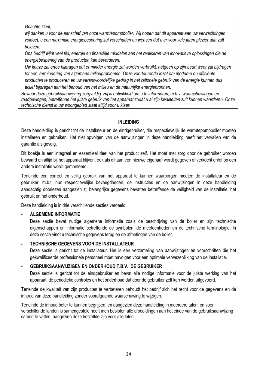Geachte klant, wij danken u voor de aanschaf van onze warmtepompboiler. Wij hopen dat dit apparaat aan uw verwachtingen voldoet, u een maximale energiebesparing zal verschaffen en wensen dat u er voor vele jaren plezier aan zult beleven. Ons bedrijf wijdt veel tijd, energie en financiële middelen aan het realiseren van innovatieve oplossingen die de energiebesparing van de producten kan bevorderen. Uw keuze zal ertoe bijdragen dat er minder energie zal worden verbruikt, hetgeen op zijn beurt weer zal bijdragen tot een vermindering van algemene milieuproblemen. Onze voortdurende inzet om moderne en efficiënte producten te produceren en uw verantwoordelijke gedrag in het rationele gebruik van de energie kunnen dus actief bijdragen aan het behoud van het milieu en de natuurlijke energiebronnen. Bewaar deze gebruiksaanwijzing zorgvuldig. Hij is ontwikkeld om u te informeren, m.b.v. waarschuwingen en raadgevingen, betreffende het juiste gebruik van het apparaat zodat u al zijn kwaliteiten zult kunnen waarderen. Onze technische dienst in uw woongebied staat altijd voor u klaar. INLEIDING Deze handleiding is gericht tot de installateur en de eindgebruiker, die respectievelijk de warmtepompboiler moeten installeren en gebruiken. Het niet opvolgen van de aanwijzingen in deze handleiding heeft het vervallen van de garantie als gevolg. Dit boekje is een integraal en essentieel deel van het product zelf. Het moet met zorg door de gebruiker worden bewaard en altijd bij het apparaat blijven, ook als dit aan een nieuwe eigenaar wordt gegeven of verkocht en/of op een andere installatie wordt gemonteerd. Teneinde een correct en veilig gebruik van het apparaat te kunnen waarborgen moeten de installateur en de gebruiker, m.b.t. hun respectievelijke bevoegdheden, de instructies en de aanwijzingen in deze handleiding aandachtig doorlezen aangezien zij belangrijke gegevens bevatten betreffende de veiligheid van de installatie, het gebruik en het onderhoud. Deze handleiding is in drie verschillende secties verdeeld: