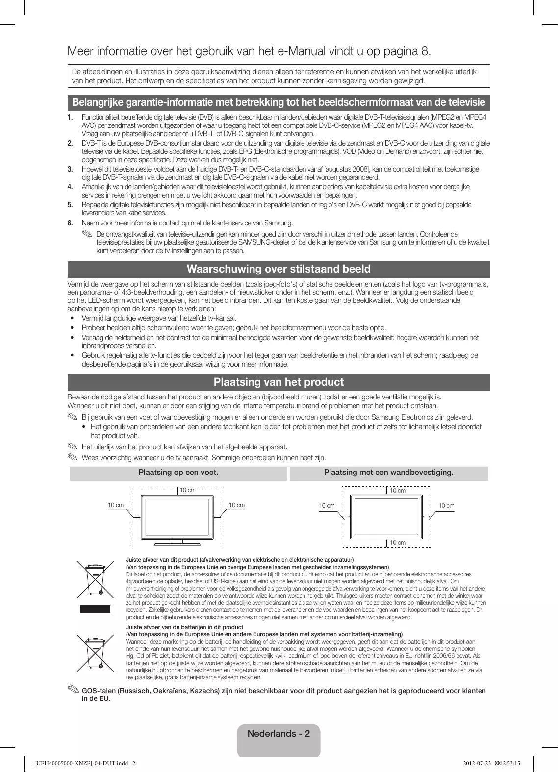 Functionaliteit betreffende digitale televisie (DVB) is alleen beschikbaar in landen/gebieden waar digitale DVB-T-televisiesignalen (MPEG2 en MPEG4 AVC) per zendmast worden uitgezonden of waar u toegang hebt tot een compatibele DVB-C-service (MPEG2 en MPEG4 AAC) voor kabel-tv. Vraag aan uw plaatselijke aanbieder of u DVB-T- of DVB-C-signalen kunt ontvangen. DVB-T is de Europese DVB-consortiumstandaard voor de uitzending van digitale televisie via de zendmast en DVB-C voor de uitzending van digitale televisie via de kabel. Bepaalde specifieke functies, zoals EPG (Elektronische programmagids), VOD (Video on Demand) enzovoort, zijn echter niet opgenomen in deze specificatie. Deze werken dus mogelijk niet. Hoewel dit televisietoestel voldoet aan de huidige DVB-T- en DVB-C-standaarden vanaf [augustus 2008], kan de compatibiliteit met toekomstige digitale DVB-T-signalen via de zendmast en digitale DVB-C-signalen via de kabel niet worden gegarandeerd. Afhankelijk van de landen/gebieden waar dit televisietoestel wordt gebruikt, kunnen aanbieders van kabeltelevisie extra kosten voor dergelijke services in rekening brengen en moet u wellicht akkoord gaan met hun voorwaarden en bepalingen. Bepaalde digitale televisiefuncties zijn mogelijk niet beschikbaar in bepaalde landen of regio's en DVB-C werkt mogelijk niet goed bij bepaalde leveranciers van kabelservices. Neem voor meer informatie contact op met de klantenservice van Samsung. ✎✎ De ontvangstkwaliteit van televisie-uitzendingen kan minder goed zijn door verschil in uitzendmethode tussen landen. Controleer de televisieprestaties bij uw plaatselijke geautoriseerde SAMSUNG-dealer of bel de klantenservice van Samsung om te informeren of u de kwaliteit kunt verbeteren door de tv-instellingen aan te passen. Waarschuwing over stilstaand beeld Vermijd de weergave op het scherm van stilstaande beelden (zoals jpeg-foto's) of statische beeldelementen (zoals het logo van tv-programma's, een panorama- of 4:3-beeldverhouding, een aandelen- of nieuwsticker onder in het scherm, enz.). Wanneer er langdurig een statisch beeld op het LED-scherm wordt weergegeven, kan het beeld inbranden. Dit kan ten koste gaan van de beeldkwaliteit. Volg de onderstaande aanbevelingen op om de kans hierop te verkleinen: