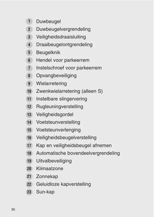 Gebruiksaanwijzing Kap en veiligheidsbeugel Als u de bajonetsluiting 17 heeft ingedrukt, kunt u de kap of de veiligheidsbeugel er uit trekken. Als u de beugel insteekt, moet er goed op letten, dat hij goed vastklikt en dat er geen delen van de stof mee vastgeklemd worden. Door de instelknoppen 16 van binnen in te drukken, kunt u de veiligheidsbeugel zwenken. WAARSCHUWING! De kapbeugel van sportwagen en de veiligheidsbeugel zijn niet geschikt om de sportwagen mee te dragen. Sun-kap Om de kap geruisloos te verstellen, drukt u de beide voorste beugels van de kap 22 ineen. U kunt de kap in een zonnescherm veranderen. Dat doet u door de ritssluiting open te maken, waardoor u het achterste gedeelte van de kap 23 kunt wegnemen. Door de beide ritssluitingen 20 open te maken en de flap van de kap omhoog te klappen, voorkomt u hittestuwing en zorgt u voor een goede ventilatie. Als extra bescherming kunt u de zonneklep 21 uitklappen. Vastzetbare zwenkwielen (alleen S) Om de zwenkwielen vast te zetten, draait u aan de kappen 10 totdat de rode stip verschijnt; de wielen worden vanzelf gearrêteerd zodra zij in rijrichting staan. Om ze te lossen, draait u aan de kappen 10 totdat de groene stip verschijnt. Om ze af te nemen, drukt u op de drukknop in het midden van de kap 10 en trekt u het wiel uit de arrêtering. Om het wiel vast te maken, steekt u het met de bevestigingsbout helemaal in de arrêtering en drukt u de knop weer in. Instelbare slingervering Door aan de stelgreep 11 te draaien, kunt u de wagen instellen op een zachte of een sportieve vering. Automatische bovendeelvergrendeling Plaats het sportwageninzetstuk zodanig op het chassis, dat de twee zijdelingse beugels aan de zijkant aan elke zijde vastklikken in de daarvoor bedoelde gleuven