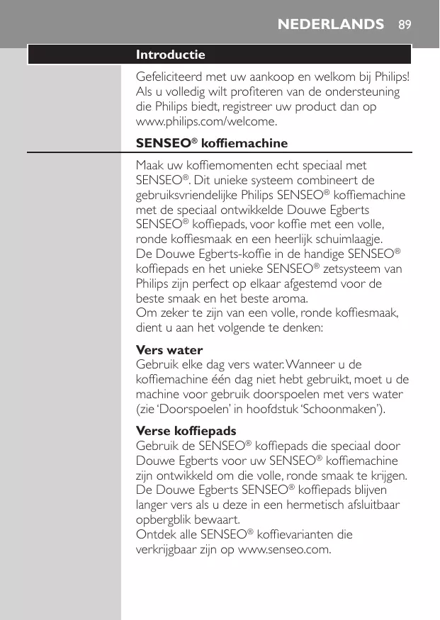 café SENSEO® est trop fort. Si vous préférez une saveur plus douce, essayez les dosettes SENSEO® avec un arôme moins fort. Le café n’est N’utilisez pas de tasses trop grandes car le café y pas assez chaud. refroidit plus rapidement. Utilisez des tasses d’une capacité minimale de 150 ml. Nederlands 89 Introductie Gefeliciteerd met uw aankoop en welkom bij Philips! Als u volledig wilt profiteren van de ondersteuning die Philips biedt, registreer uw product dan op www.philips.com/welcome. SENSEO® koffiemachine Maak uw koffiemomenten echt speciaal met SENSEO®. Dit unieke systeem combineert de gebruiksvriendelijke Philips SENSEO® koffiemachine met de speciaal ontwikkelde Douwe Egberts SENSEO® koffiepads, voor koffie met een volle, ronde koffiesmaak en een heerlijk schuimlaagje. De Douwe Egberts-koffie in de handige SENSEO® koffiepads en het unieke SENSEO® zetsysteem van Philips zijn perfect op elkaar afgestemd voor de beste smaak en het beste aroma. Om zeker te zijn van een volle, ronde koffiesmaak, dient u aan het volgende te denken: Vers water Gebruik elke dag vers water. Wanneer u de koffiemachine één dag niet hebt gebruikt, moet u de machine voor gebruik doorspoelen met vers water (zie ‘Doorspoelen’ in hoofdstuk ‘Schoonmaken’). Verse koffiepads Gebruik de SENSEO® koffiepads die speciaal door Douwe Egberts voor uw SENSEO® koffiemachine zijn ontwikkeld om die volle, ronde smaak te krijgen. De Douwe Egberts SENSEO® koffiepads blijven langer vers als u deze in een hermetisch afsluitbaar opbergblik bewaart. Ontdek alle SENSEO® koffievarianten die verkrijgbaar zijn op www.senseo.com.