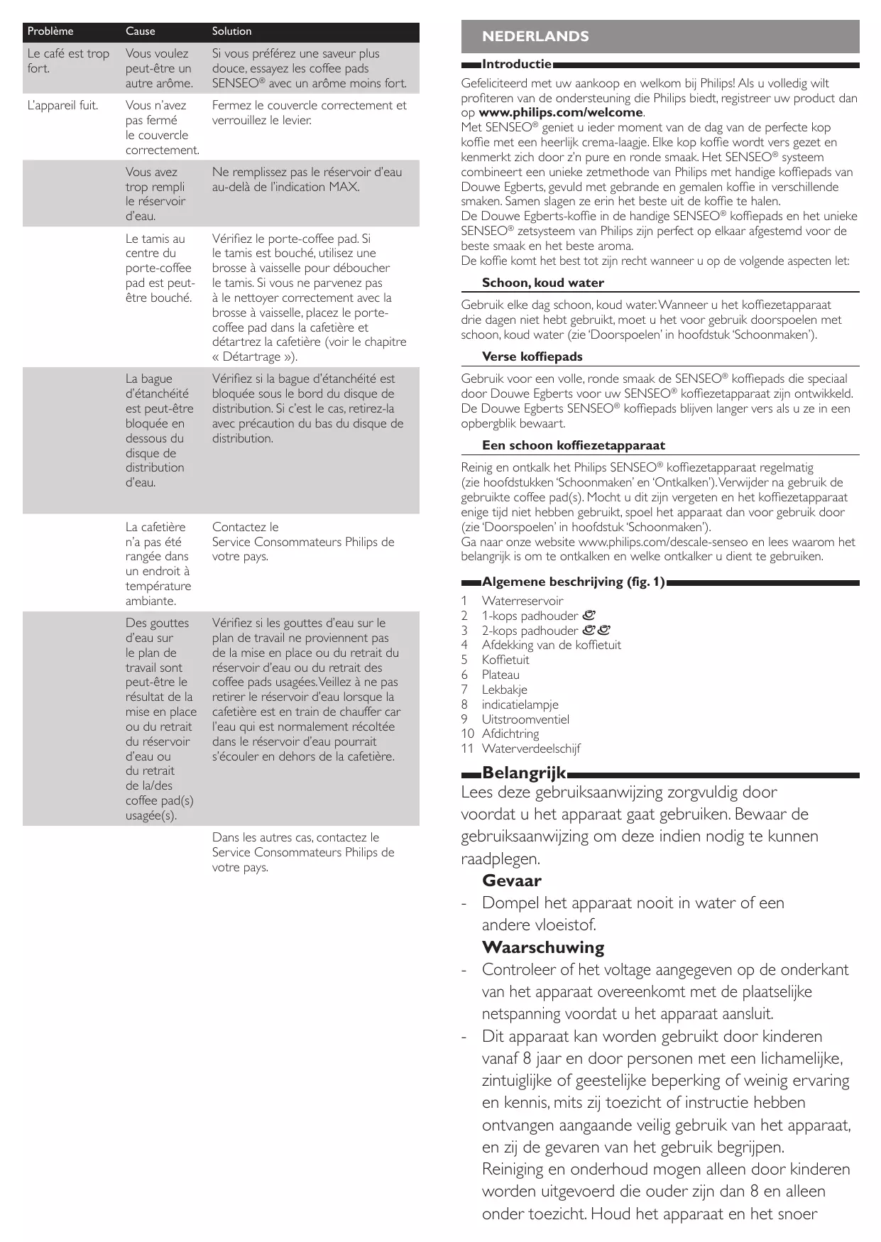 Algemene beschrijving (fig. 1) Waterreservoir 1-kops padhouder ° 2-kops padhouder °° Afdekking van de koffietuit Koffietuit Plateau Lekbakje indicatielampje Uitstroomventiel Afdichtring Waterverdeelschijf Belangrijk Lees deze gebruiksaanwijzing zorgvuldig door voordat u het apparaat gaat gebruiken. Bewaar de gebruiksaanwijzing om deze indien nodig te kunnen raadplegen. Gevaar -- Dompel het apparaat nooit in water of een andere vloeistof. Waarschuwing -- Controleer of het voltage aangegeven op de onderkant van het apparaat overeenkomt met de plaatselijke netspanning voordat u het apparaat aansluit. -- Dit apparaat kan worden gebruikt door kinderen vanaf 8 jaar en door personen met een lichamelijke, zintuiglijke of geestelijke beperking of weinig ervaring en kennis, mits zij toezicht of instructie hebben ontvangen aangaande veilig gebruik van het apparaat, en zij de gevaren van het gebruik begrijpen. Reiniging en onderhoud mogen alleen door kinderen worden uitgevoerd die ouder zijn dan 8 en alleen onder toezicht. Houd het apparaat en het snoer