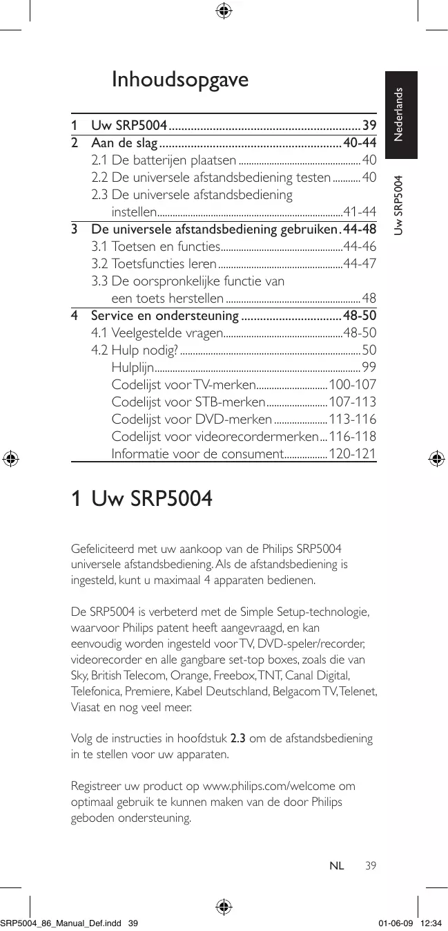 • -118 Informatie voor de consument -121 Uw SRP5004 Inhoudsopgave 1 Uw SRP5004 Gefeliciteerd met uw aankoop van de Philips SRP5004 universele afstandsbediening. Als de afstandsbediening is ingesteld, kunt u maximaal 4 apparaten bedienen. De SRP5004 is verbeterd met de Simple Setup-technologie, waarvoor Philips patent heeft aangevraagd, en kan eenvoudig worden ingesteld voor TV, DVD-speler/recorder, videorecorder en alle gangbare set-top boxes, zoals die van Sky, British Telecom, Orange, Freebox, TNT, Canal Digital, Telefonica, Premiere, Kabel Deutschland, Belgacom TV, Telenet, Viasat en nog veel meer. Volg de instructies in hoofdstuk 2.3 om de afstandsbediening in te stellen voor uw apparaten. Registreer uw product op www.philips.com/welcome om optimaal gebruik te kunnen maken van de door Philips geboden ondersteuning. SRP5004_86_Manual_Def.indd 39 p. 120