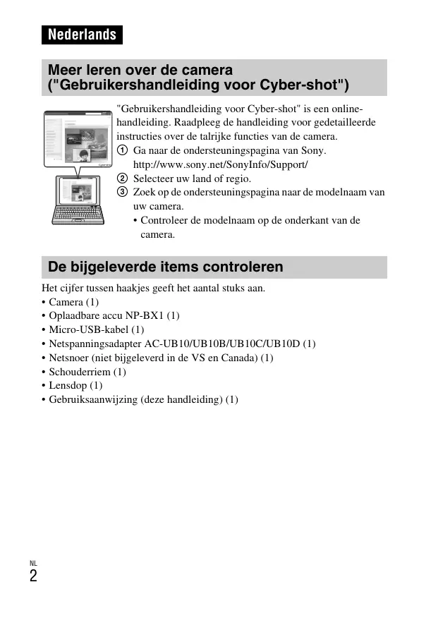 Nederlands Meer leren over de camera ("Gebruikershandleiding voor Cyber-shot") "Gebruikershandleiding voor Cyber-shot" is een onlinehandleiding. Raadpleeg de handleiding voor gedetailleerde instructies over de talrijke functies van de camera. 1 Ga naar de ondersteuningspagina van Sony. http://www.sony.net/SonyInfo/Support/ 2 Selecteer uw land of regio. 3 Zoek op de ondersteuningspagina naar de modelnaam van uw camera.