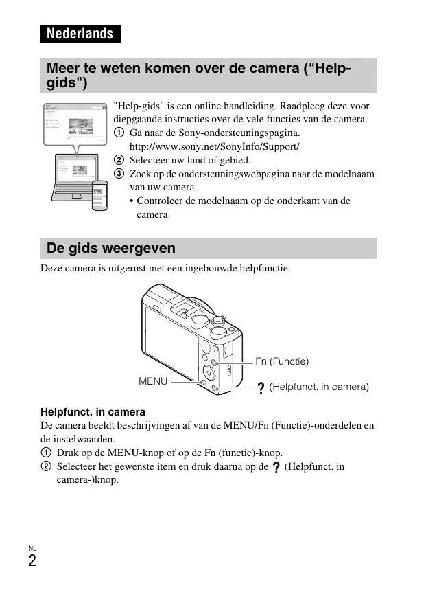 Nederlands Meer te weten komen over de camera ("Helpgids") "Help-gids" is een online handleiding. Raadpleeg deze voor diepgaande instructies over de vele functies van de camera. 1 Ga naar de Sony-ondersteuningspagina. http://www.sony.net/SonyInfo/Support/ 2 Selecteer uw land of gebied. 3 Zoek op de ondersteuningswebpagina naar de modelnaam van uw camera.