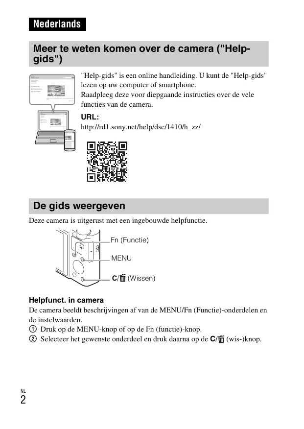 Nederlands Meer te weten komen over de camera ("Helpgids") "Help-gids" is een online handleiding. U kunt de "Help-gids" lezen op uw computer of smartphone. Raadpleeg deze voor diepgaande instructies over de vele functies van de camera. URL: http://rd1.sony.net/help/dsc/1410/h_zz/ De gids weergeven Deze camera is uitgerust met een ingebouwde helpfunctie. Fn (Functie) MENU