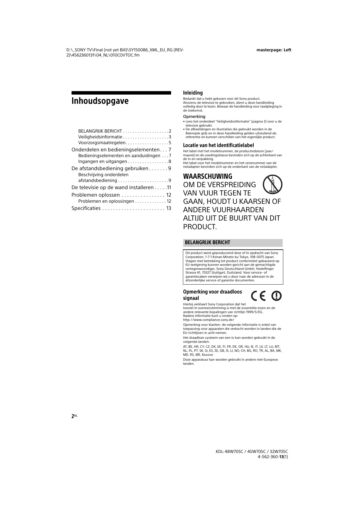PRODUCT. BELANGRIK BERICHT Dit product werd geproduceerd door of in opdracht van Sony Corporation, -7-1 Konan Minato-ku Tokyo, 108-0075 Japan Vragen met betrekking tot product conformiteit gebaseerd op EU-wetgeving kunnen vrorden gericht aan de gemachtigde vertegenwoordiger, Sony Deutschland GmbH, Hedeffnger Strasse 61, 70327 Stuttgart, Duitsland. Voor service- of garantiezaken verwiizen wi u door naar de adressen in de afzonderljke service of garantie documenten signaal Hierbij verklaart Sony Corporation dat het toestel in overeenstemming is met de essentiële eisen en de andere relevante bepalingen van richtlin 1999/5/EG. Nadere infarmatie kunt u vinden op http://www.compliance.sony.de/ ‘Opmerking voor klanten: de volgende informatie is enkel van toepassing voor apparaten die verkocht worden in landen die de EU-richtinen in acht nemen. Opmerking voor draadloos Het draadieze systeem van een tv kan worden gebruikt in de volgende landen: AT, BE, HR, CY, CZ, DK, EE, Fi FR, DE, GR, HU, IE, I, LV, LT, LU, MT, NL, PL, PT, SK, SI, ES, SE, GB, IS, LI, NO, CH, BG, RO, TR, AL, BA, NK, MD, RS, ME, Kosovo Deze apparatuur kan worden gebruikt in andere niet-Europese landen. KDL-48W705C / 40W705C / 32W705C 4-562-360-13(1)