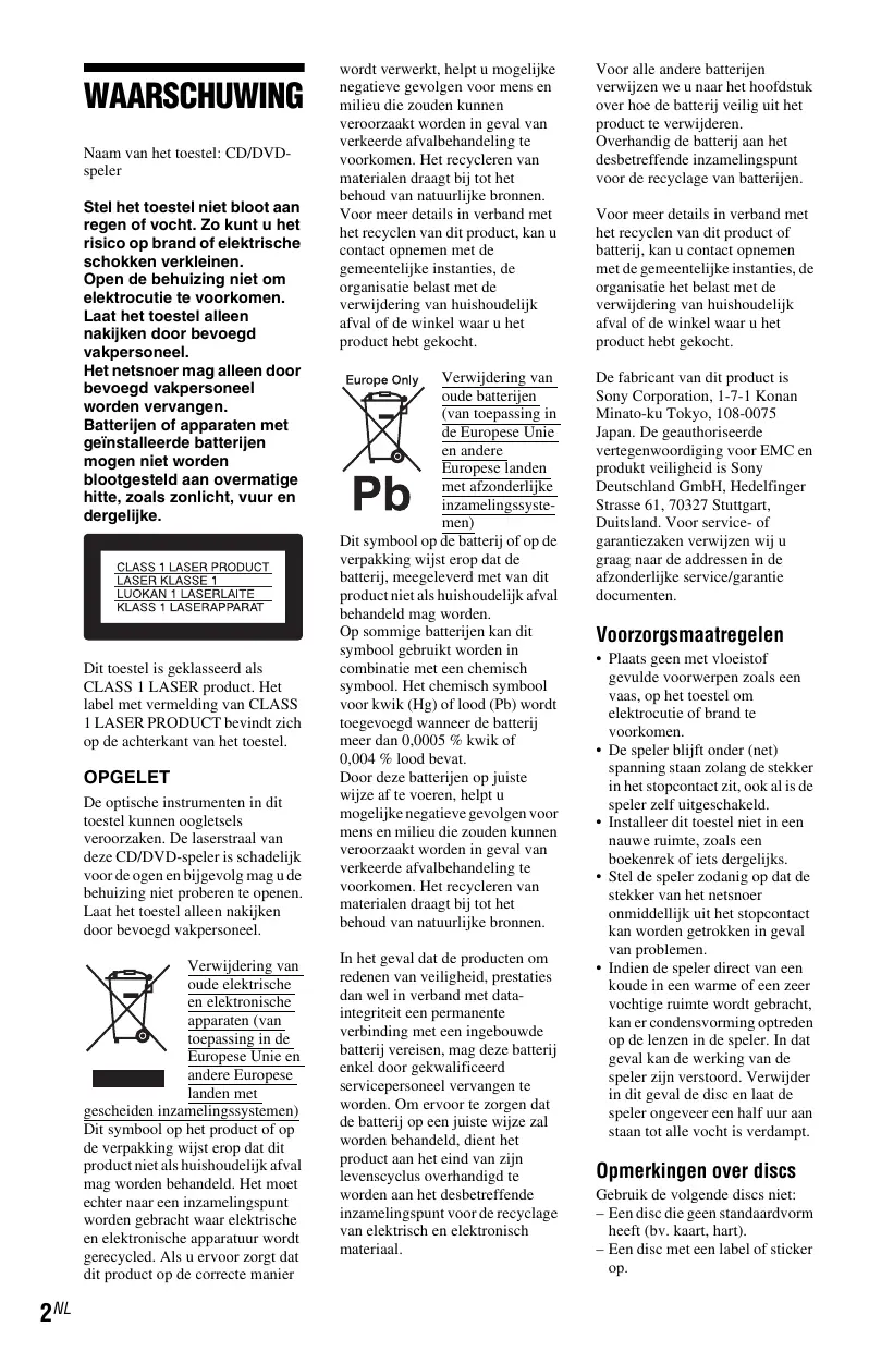 Para las demás baterías, consulte la sección donde se indica cómo extraer la batería del producto de forma segura. Deposite la batería en el correspondiente punto de recogida para el reciclado de baterías. Para recibir información detallada sobre el reciclaje de este producto o de la batería, póngase en contacto con el ayuntamiento, el punto de recogida más cercano o el establecimiento donde ha adquirido el producto. El fabricante de este producto es Sony Corporation, 1-7-1 Konan Minato-ku Tokyo, 108-0075 CA pueda ser desenchufado de la toma de corriente de la pared inmediatamente en caso de problema. • Si traslada el reproductor directamente de un lugar frío a uno cálido o si lo instala en una sala muy húmeda, es posible que se condense humedad en las lentes de su interior. Si esto ocurre, es posible que el reproductor no funcione correctamente. En este caso, extraiga el disco y deje encendido el reproductor durante