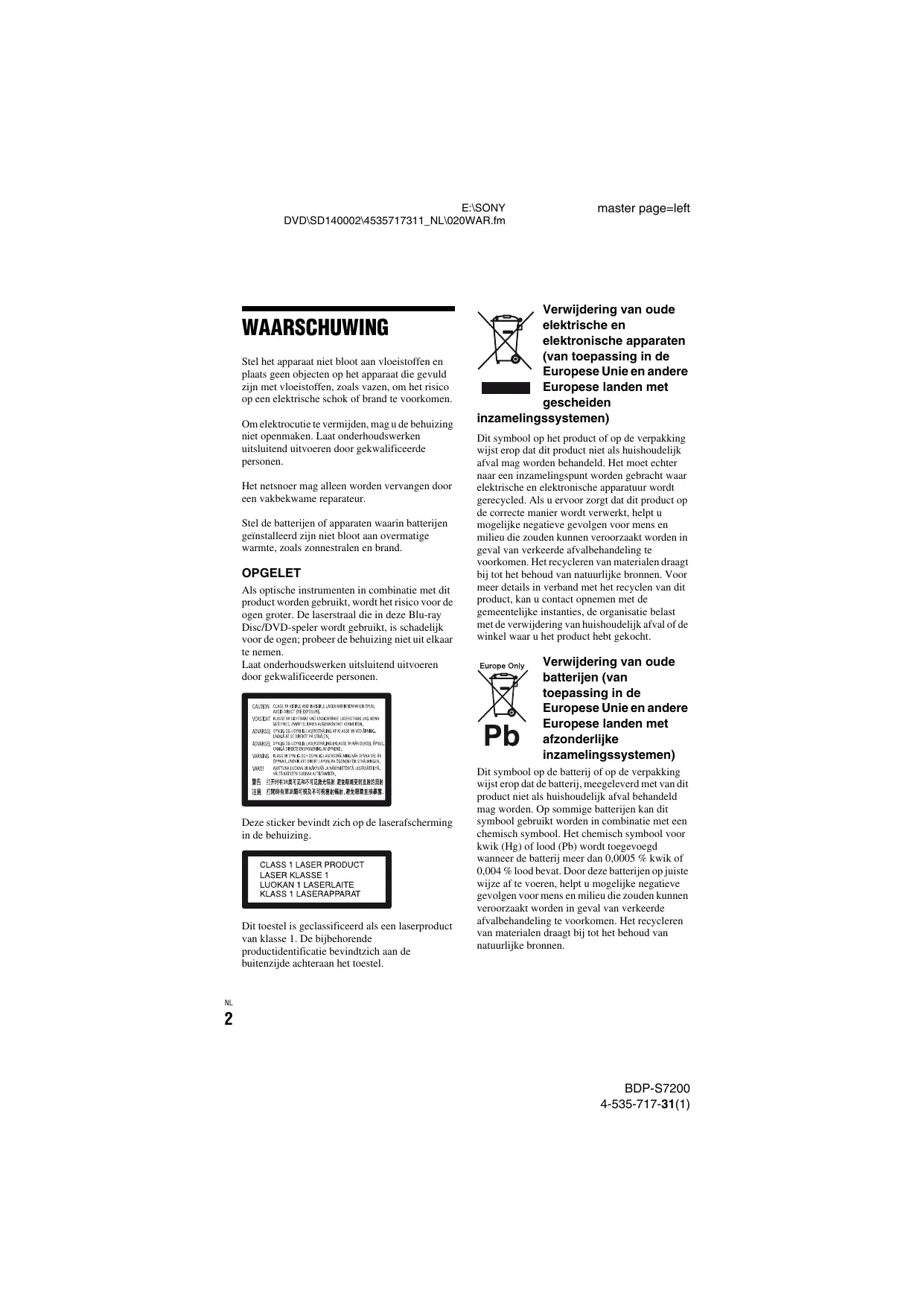 LASER KLASSE 1 LUOKAN 1 LASERLAITE. KLASS 1 LASERAPPARAT Dit toestel is geclassificeerd als een laserproduct van klasse 1. De bijbehorende productidentificatie bevindtzich aan de buitenzijde achteraan het toestel. Verwijdering van oude elektrische en elektronische apparaten {van toepassing in de Europese Unie en andere Europese landen met gescheiden inzamelingssystemen) Dit symbool op het product of op de verpakking wijsterop dat dit product niet als huishoudelijk afval mag worden behandeld. Het moet echter naar een inzamelingspunt worden gebracht waar elektrische en elektronische apparatuur wordt gerecycled. As u ervoor zorgt dat dit product op de correcte manier wordt verwerkt, helpt u mogelijke negatieve gevolgen voor mens en milieu die zouden kunnen veroorzaakt worden in geval van verkeerde afvalbehandeling te voorkomen. Het recycleren van materialen draagt bij tot het behoud van natuurlijke bronnen. Voor meer details in verband met het recyclen van dit product, kan ü contact opnemen met de gemeentelijke instanties, de organisatie belast met de verwijdering van huishoudelijk afval of de winkel waar u het product hebt gekocht Verwijdering van oude batterijen (van toepassing in de Europese Unie en andere Europese landen met P b afzonderlijke inzamelingssystemen) mbool op de batterij of op de verpakking wijst erop dat de batterij, meegeleverd met van dit product niet als huishoudelijk afval behandeld mag worden. Op sommige batterijen kan dit symbool gebruikt worden in combinatie met een chemisch symbool. Het chemisch symbool voor kwik (Hg) of lood (Pb) wordt tocgevoegd wanneer de batterij meer dan 0,000$ % kwik of 0,004 % lood bevat. Door deze batterijen op juiste wijze af te voeren, helpt u mogelijke negatieve gevolgen voor mens en milieu die zouden kunnen Veroorzaakt worden in geval van verkeerde afvalbehandeling te voorkomen. Het recycleren van materialen draagt bij tot het behoud van natuurlijke bronnen. Europe Ony BDP-S7200 4-585-717-31(1)