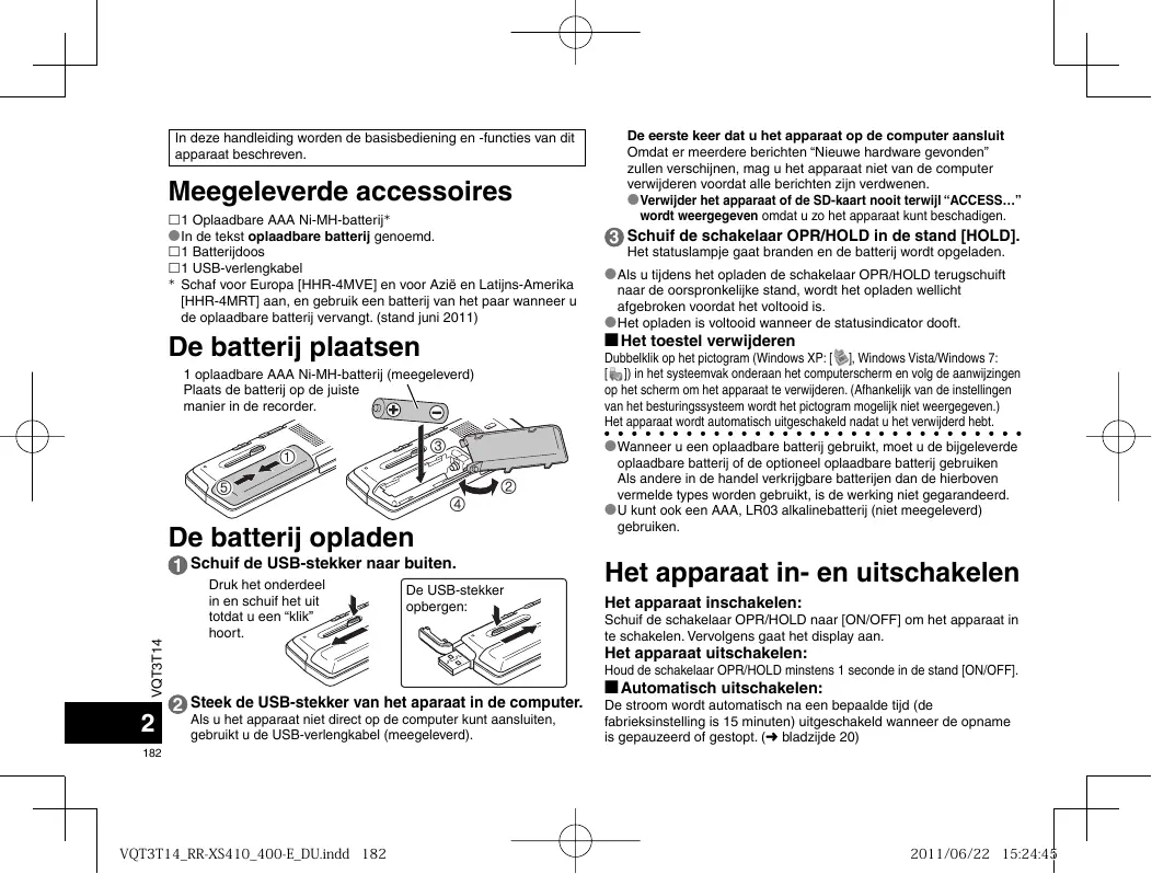 VQT3T14̲RR-XS410̲400-E̲SP.indd 181 2011/06/22 11:29:59 In deze handleiding worden de basisbediening en -functies van dit apparaat beschreven. Meegeleverde accessoires 1 Oplaadbare AAA Ni-MH-batterij *In de tekst oplaadbare batterij genoemd. 1 Batterijdoos 1 USB-verlengkabel Schaf voor Europa [HHR-4MVE] en voor Azië en Latijns-Amerika [HHR-4MRT] aan, en gebruik een batterij van het paar wanneer u de oplaadbare batterij vervangt. (stand juni 2011) De batterij plaatsen
