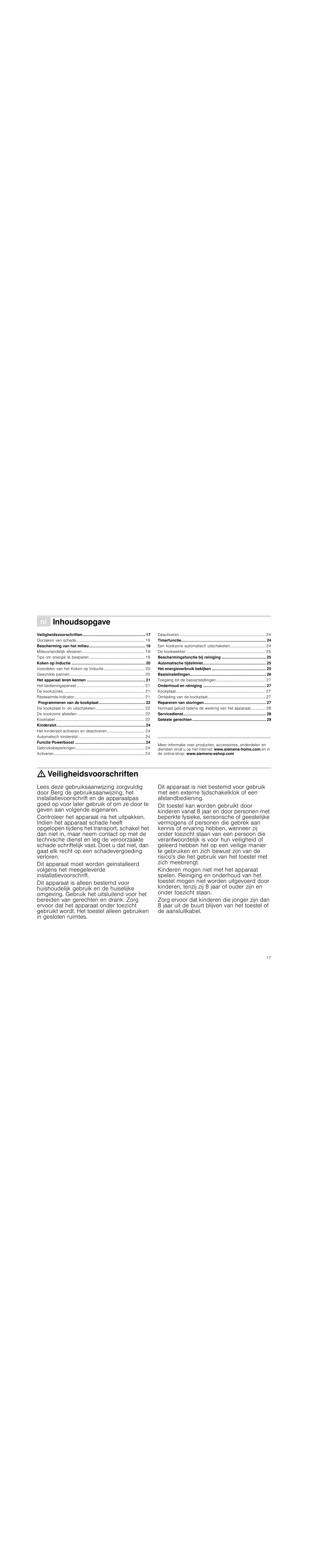 Veiligheidsvoorschriften. Oorzaken van schade Bescherming van het milieu Milieuvriendelijk afvoeren . Tips om energie te besparei Koken op Inductie … Voordelen van het Koken op Inductie Geschikte pannen.. Het apparaat leren kennen Het bedieningspaneel De kookzones…. Restwarmie-indicator Programmeren van de kookplaat De kookplaat in- en uitschakelen De kookzone afstellen Kooktabel Kindersloi
