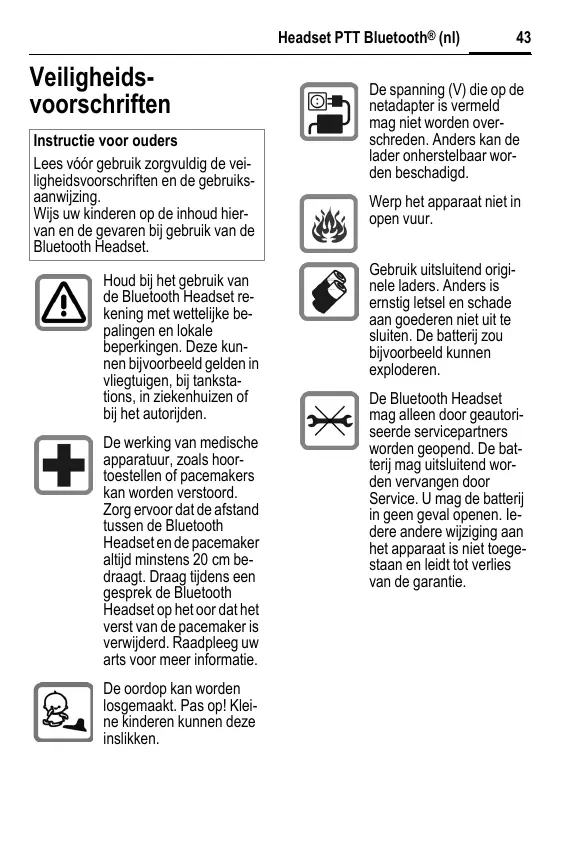 Headset PTT Bluetooth® (nl) Veiligheidsvoorschriften Instructie voor ouders Lees vóór gebruik zorgvuldig de veiligheidsvoorschriften en de gebruiksaanwijzing. Wijs uw kinderen op de inhoud hiervan en de gevaren bij gebruik van de Bluetooth Headset. Houd bij het gebruik van de Bluetooth Headset rekening met wettelijke bepalingen en lokale beperkingen. Deze kunnen bijvoorbeeld gelden in vliegtuigen, bij tankstations, in ziekenhuizen of bij het autorijden. De werking van medische apparatuur, zoals hoortoestellen of pacemakers kan worden verstoord. Zorg ervoor dat de afstand tussen de Bluetooth Headset en de pacemaker altijd minstens 20 cm bedraagt. Draag tijdens een gesprek de Bluetooth Headset op het oor dat het verst van de pacemaker is verwijderd. Raadpleeg uw arts voor meer informatie. De oordop kan worden losgemaakt. Pas op! Kleine kinderen kunnen deze inslikken.