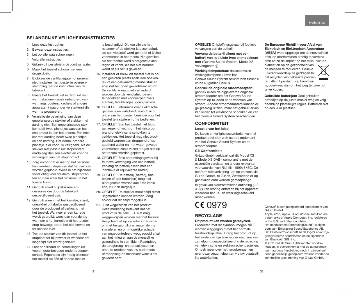 De Europese Richtlijn voor Afval van Elektrisch en Elektronisch Apparatuur ( AEEA ) werd opgelegd om de hoeveelheid afval op stortterreinen ernstig te verminderen en zo de impact op het milieu van de planeet en op de gezondheid van de mensen te reduceren. Gelieve u verantwoordelijk te gedragen bij het recyclen van gebruikte producten. Als dit product nog bruikbaar is, overweeg dan om het weg te geven of te verkopen. OPGELET: Ontploffingsgevaar bij foutieve vervanging van de batterij. Vervang de batterij alleen met een batterij van het juiste type en modelnummer ( Geneva Sound System, Model XS Vervangbatterij ). Werkingstemperatuur: de aanbevolen werkingstemperatuur van het Geneva Sound System bevindt zich tussen 5 en de 40 graden Celsius. Gebruik de originele stroomadapter: gebruik alleen de bijgeleverde originele stroomadapter om het Geneva Sound System op te laden en te voorzien van stroom. Andere stroomadapters kunnen er gelijkaardig uitzien, maar het gebruik ervan kan leiden tot elektrische schokken en kan het Geneva Sound System beschadigen. Gebruikte batterijen: Gooi gebruikte batterijen op de juiste manier weg en volg daarbij de plaatselijke regels. Batterijen niet op een vuur plaatsen. Conformiteit Locatie van het label De labels en veiligheidssymbolen van het product bevinden zich aan de onderkant van het Geneva Sound System en de stroomadapter. CE Conformiteit G-Lab Gmbh verklaart dat dit Model XS & Model XS DAB+ compliant is met de essentiële vereisten en andere relevante voorwaarden van Richtlijn 1999 / 5 / EC. De conformiteitsverklaring kan op verzoek via G-Lab GmbH, te Zürich, Zwitserland of op genevalab.com worden geraadpleegd. In geval van elektrostatische ontlading ( + / 4 kV ) kan storing ontstaan bij het apparaat waardoor het uit- en weer ingeschakeld moet worden.