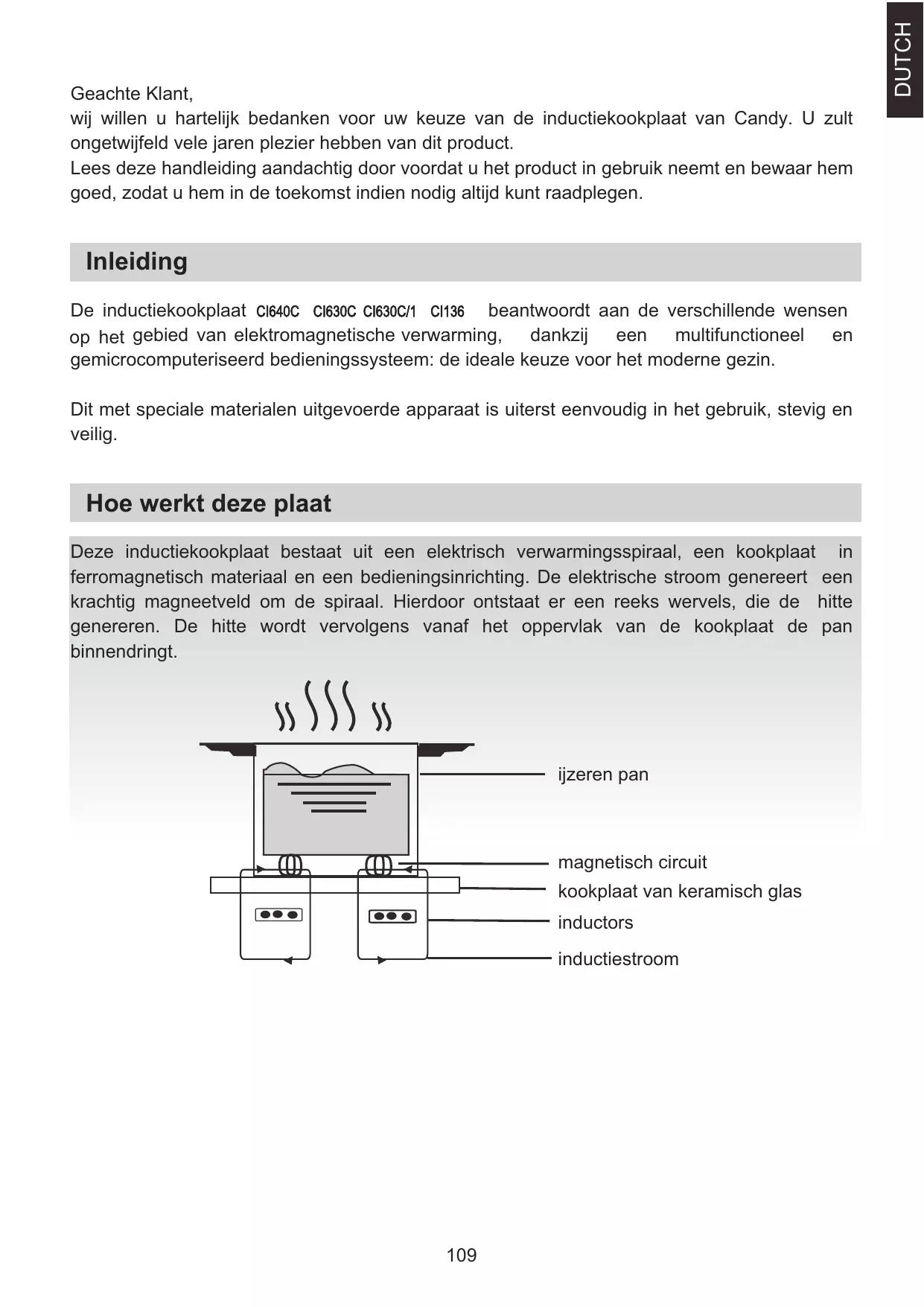DUTCH Geachte Klant, wij willen u hartelijk bedanken voor uw keuze van de inductiekookplaat van Candy. U zult ongetwijfeld vele jaren plezier hebben van dit product. Lees deze handleiding aandachtig door voordat u het product in gebruik neemt en bewaar hem goed, zodat u hem in de toekomst indien nodig altijd kunt raadplegen. Veiligheid Installatie Installatieprocedure