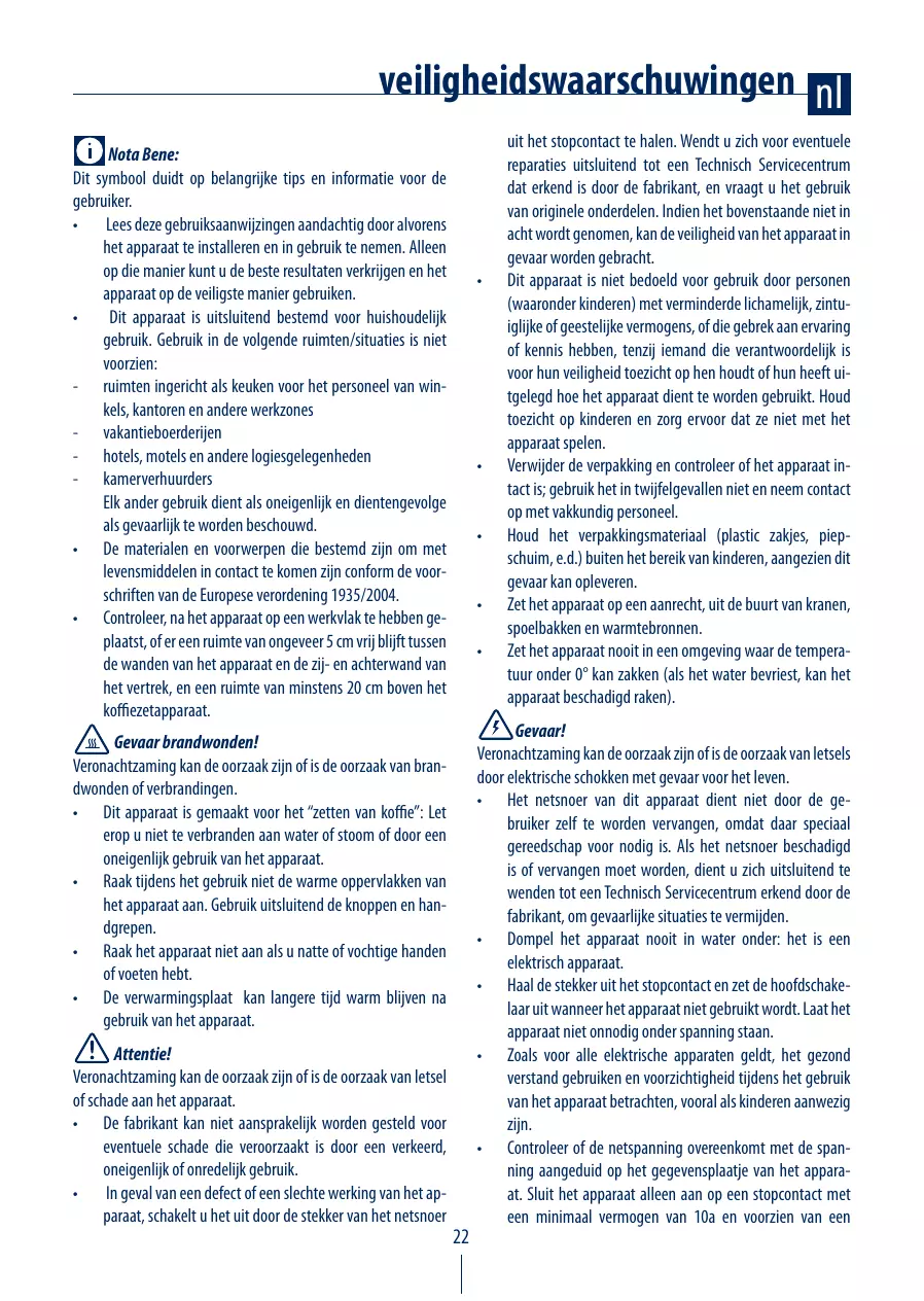 Le non-respect de ces recommandations peut entraîner un risque de brûlures. • Cet appareil est conçu pour faire du café: les projections d’eau et de vapeur ou une mauvaise utilisation de l’appareil peuvent provoquer des brûlures. • Pendant l’utilisation ne pas toucher les surfaces chaudes de l’appareil. Utiliser les poignées ou les manches. • Ne pas toucher l’appareil les mains ou les pieds mouillés ou humides. • La plaque chauffante reste chaude après l’utilisation de l’appareil. Attention! Le non-respect de ces recommandations peut entraîner des blessures ou des dommages à l’appareil. • Le fabricant ne peut être tenu pour responsable des dommages dus à une utilisation anormale, non conforme ou déraisonnable. • En cas de panne ou de mauvais fonctionnement éteignez l’appareil et débranchez la fiche de la prise. Pour toute réparation, adressez-vous exclusivement à un Centre de service agréé par le Fabricant et exigez des pièces détachées d’origine. Le non-respect de ces recommandations peut compromettre la sécurité de l’appareil.