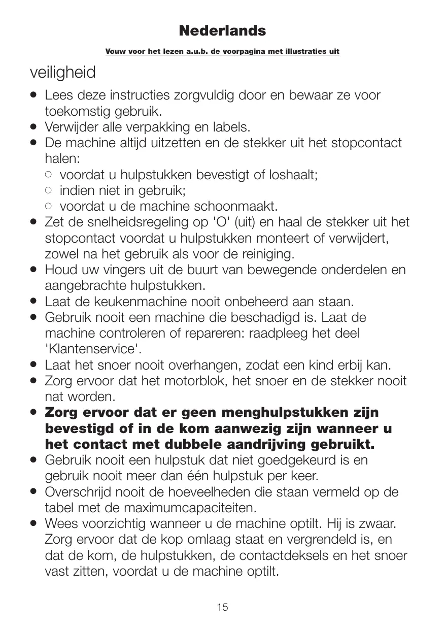 Lees deze instructies zorgvuldig door en bewaar ze voor toekomstig gebruik. Verwijder alle verpakking en labels. De machine altijd uitzetten en de stekker uit het stopcontact halen: l voordat u hulpstukken bevestigt of loshaalt; l indien niet in gebruik; l voordat u de machine schoonmaakt. Zet de snelheidsregeling op 'O' (uit) en haal de stekker uit het stopcontact voordat u hulpstukken monteert of verwijdert, zowel na het gebruik als voor de reiniging. Houd uw vingers uit de buurt van bewegende onderdelen en aangebrachte hulpstukken. Laat de keukenmachine nooit onbeheerd aan staan. Gebruik nooit een machine die beschadigd is. Laat de machine controleren of repareren: raadpleeg het deel 'Klantenservice'. Laat het snoer nooit overhangen, zodat een kind erbij kan. Zorg ervoor dat het motorblok, het snoer en de stekker nooit nat worden. Zorg ervoor dat er geen menghulpstukken zijn bevestigd of in de kom aanwezig zijn wanneer u het contact met dubbele aandrijving gebruikt. Gebruik nooit een hulpstuk dat niet goedgekeurd is en gebruik nooit meer dan één hulpstuk per keer. Overschrijd nooit de hoeveelheden die staan vermeld op de tabel met de maximumcapaciteiten. Wees voorzichtig wanneer u de machine optilt. Hij is zwaar. Zorg ervoor dat de kop omlaag staat en vergrendeld is, en dat de kom, de hulpstukken, de contactdeksels en het snoer vast zitten, voordat u de machine optilt.