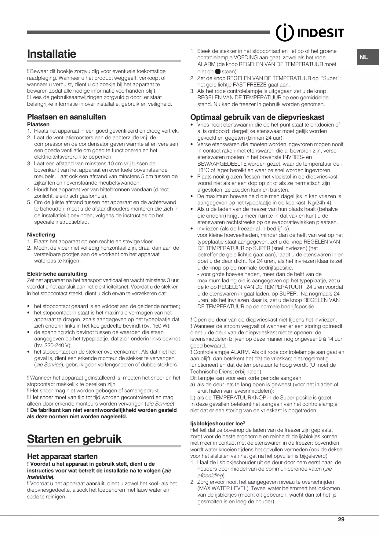 Starten en gebruik Het apparaat starten ! Voordat u het apparaat in gebruik stelt, dient u de instructies voor wat betreft de installatie na te volgen (zie Installatie). ! Voordat u het apparaat aansluit, dient u zowel het koel- als het diepvriesgedeelte, alsook het toebehoren met lauw water en soda te reinigen.