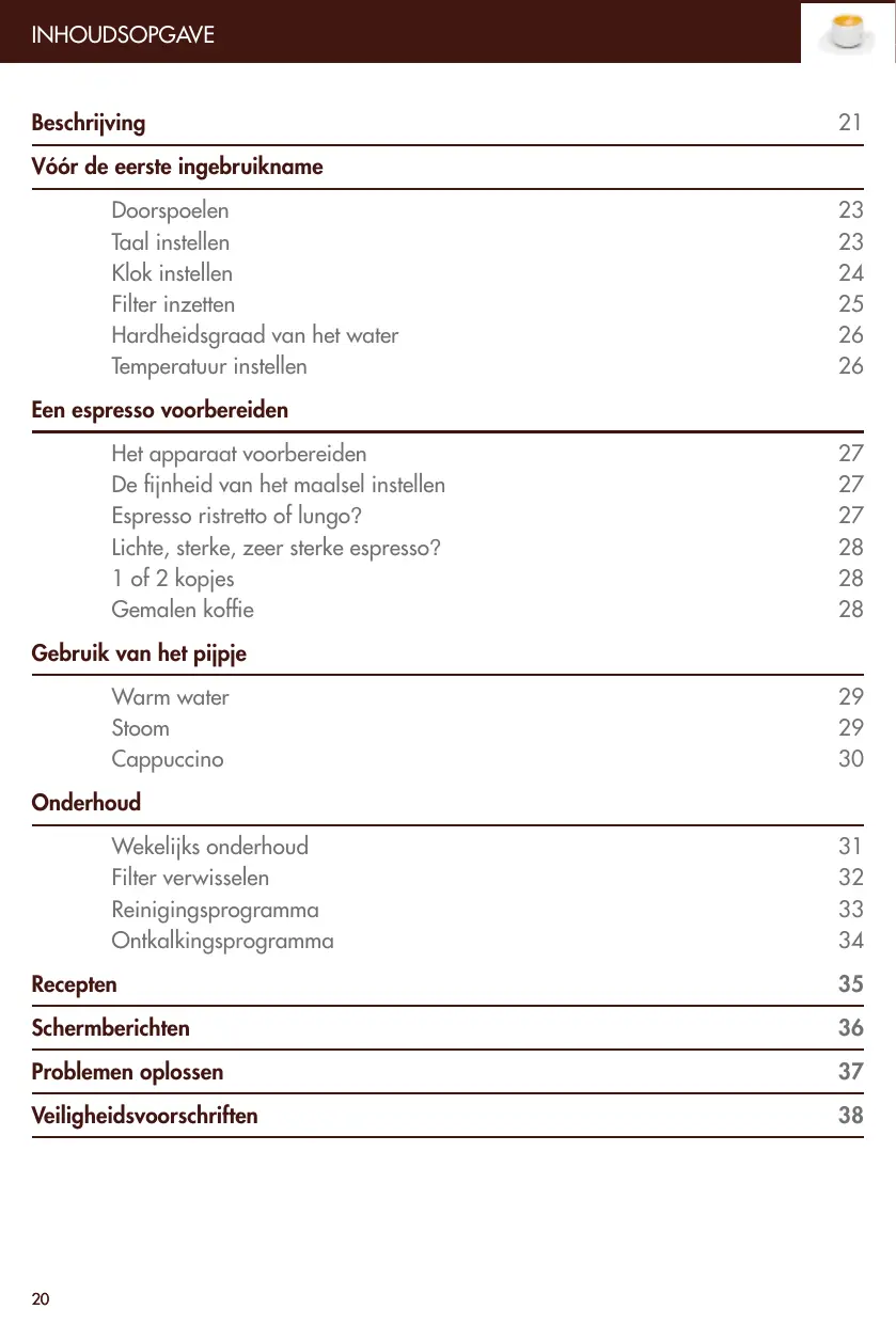 Druk op P en dan op >. Selecteer PROGRAM DETARTR. Druk op ok. Druk op ok. Ga verder zoals vermeld in de automatische modus. RECEPTEN Espresso Een espresso wordt gekenmerkt door de kleur, tussen roodbruin en hazelnootbruin, het romige schuim en de krachtige aroma’s… Een espresso bestaat uit ongeveer 40 à 50 ml zwarte koffie, geserveerd in een kopje van 60 ml. Cappuccino Vul een grote kop tot 1/3 met melk (Zie hoofdstuk Cappuccino p.30). Laat de melk schuimen met behulp van het cappuccino-accessoire. Giet het melkschuim op uw espresso en bestrooi met cacao of laat de espresso op uw melkschuim uitstromen. Ristretto Dit is een geconcentreerde espresso: hij wordt gemaakt met dezelfde hoeveelheid koffie, maar is twee keer minder verdund. De hoeveelheid is niet meer dan 30 ml. Macchiato «Macchiato» betekent «gevlekt» in het Italiaans. Deze koffie komt dichtbij de cappuccino, maar is sterker en aromatischer: bereid een kopje espresso en doe er een theelepel melkschuim op.