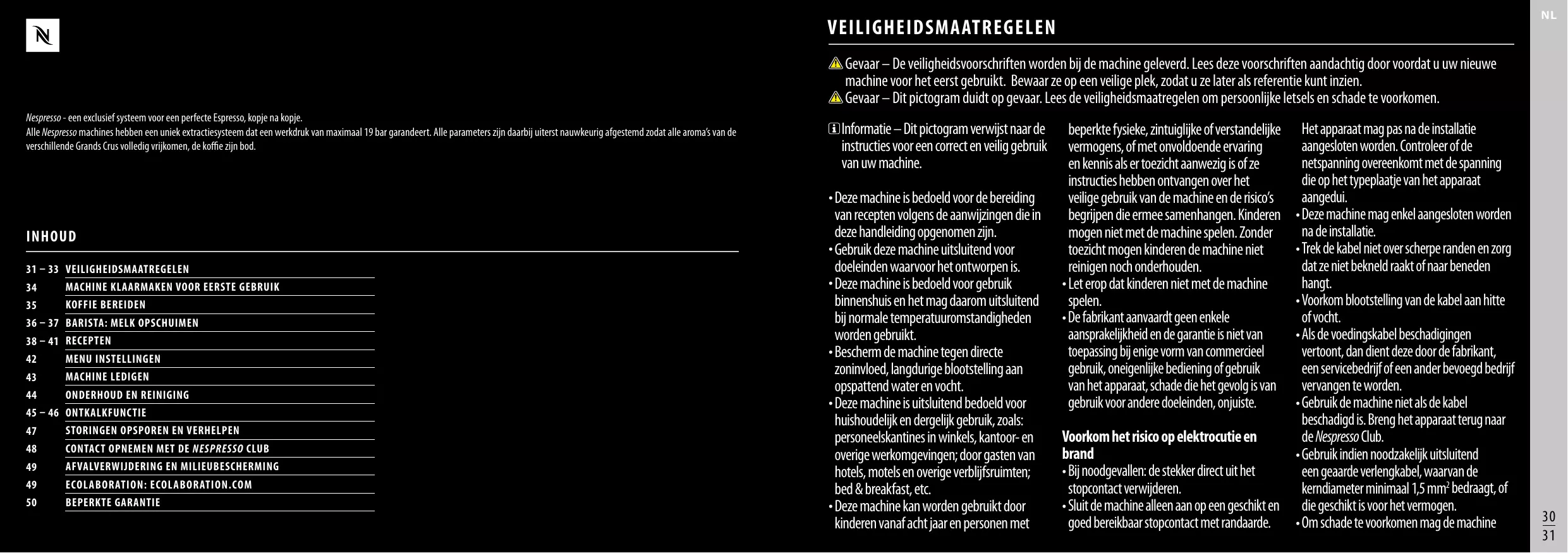 Het apparaat mag pas na de installatie aangesloten worden. Controleer of de netspanning overeenkomt met de spanning die op het typeplaatje van het apparaat aangedui. r%F[FNBDIJOFNBHFOLFMBBOHFTMPUFOXPSEFO na de installatie. r5SFLEFLBCFMOJFUPWFSTDIFSQFSBOEFOFO[PSH dat ze niet bekneld raakt of naar beneden hangt. r7PPSLPNCMPPUTUFMMJOHWBOEFLBCFMBBOIJUUF of vocht. r"MTEFWPFEJOHTLBCFMCFTDIBEJHJOHFO vertoont, dan dient deze door de fabrikant, een servicebedrijf of een ander bevoegd bedrijf vervangen te worden. r(FCSVJLEFNBDIJOFOJFUBMTEFLBCFM beschadigd is. Breng het apparaat terug naar Voorkom het risico op elektrocutie en de Nespresso Club. brand r(FCSVJLJOEJFOOPPE[BLFMJKLVJUTMVJUFOE r#JKOPPEHFWBMMFOEFTUFLLFSEJSFDUVJUIFU een geaarde verlengkabel, waarvan de stopcontact verwijderen. kerndiameter minimaal 1,5 mm2 bedraagt, of r4MVJUEFNBDIJOFBMMFFOBBOPQFFOHFTDIJLUFO die geschikt is voor het vermogen. goed bereikbaar stopcontact met randaarde. r0NTDIBEFUFWPPSLPNFONBHEFNBDIJOF beperkte fysieke, zintuiglijke of verstandelijke vermogens, of met onvoldoende ervaring en kennis als er toezicht aanwezig is of ze instructies hebben ontvangen over het veilige gebruik van de machine en de risico’s begrijpen die ermee samenhangen. Kinderen mogen niet met de machine spelen. Zonder toezicht mogen kinderen de machine niet reinigen noch onderhouden. rL et erop dat kinderen niet met de machine spelen. r%FGBCSJLBOUBBOWBBSEUHFFOFOLFMF aansprakelijkheid en de garantie is niet van toepassing bij enige vorm van commercieel gebruik, oneigenlijke bediening of gebruik van het apparaat, schade die het gevolg is van gebruik voor andere doeleinden, onjuiste.