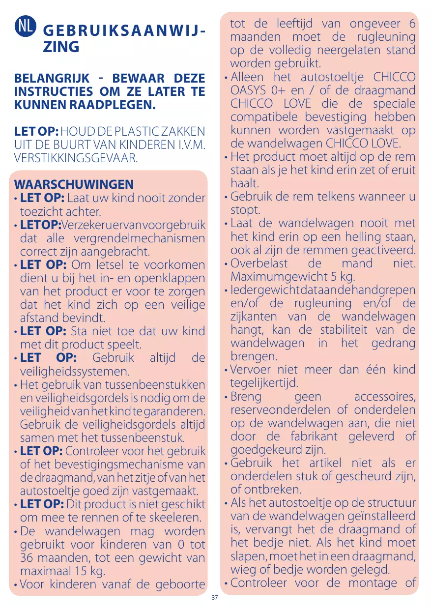 I UPU EF MFFGUJKE WBO POHFWFFS maanden moet de rugleuning op de volledig neergelaten stand worden gebruikt. r"MMFFO IFU BVUPTUPFMUKF $)*$$0 0"4:4 FO PG EF ESBBHNBOE CHICCO LOVE die de speciale compatibele bevestiging hebben kunnen worden vastgemaakt op de wandelwagen CHICCO LOVE. r)FUQSPEVDUNPFUBMUJKEPQEFSFN TUBBOBMTKFIFULJOEFSJO[FUPGFSVJU haalt. r(FCSVJLEFSFNUFMLFOTXBOOFFSV stopt. r-BBU EF XBOEFMXBHFO OPPJU NFU het kind erin op een helling staan, ook al zijn de remmen geactiveerd. r0WFSCFMBTU EF NBOE OJFU Maximumgewicht 5 kg. rIeder gewicht dat aan de handgrepen FOPG EF SVHMFVOJOH FOPG EF zijkanten van de wandelwagen hangt, kan de stabiliteit van de wandelwagen in het gedrang brengen. r7FSWPFS OJFU NFFS EBO ÊÊO LJOE tegelijkertijd. r#SFOH HFFO BDDFTTPJSFT SFTFSWFPOEFSEFMFO PG POEFSEFMFO op de wandelwagen aan, die niet EPPS EF GBCSJLBOU HFMFWFSE PG goedgekeurd zijn. r(FCSVJL IFU BSUJLFM OJFU BMT FS POEFSEFMFOTUVLPGHFTDIFVSE[JKO PGPOUCSFLFO r"MTIFUBVUPTUPFMUKFPQEFTUSVDUVVS van de wandelwagen geïnstalleerd JT WFSWBOHU IFU EF ESBBHNBOE PG het bedje niet. Als het kind moet slapen, moet het in een draagmand, XJFHPGCFEKFXPSEFOHFMFHE