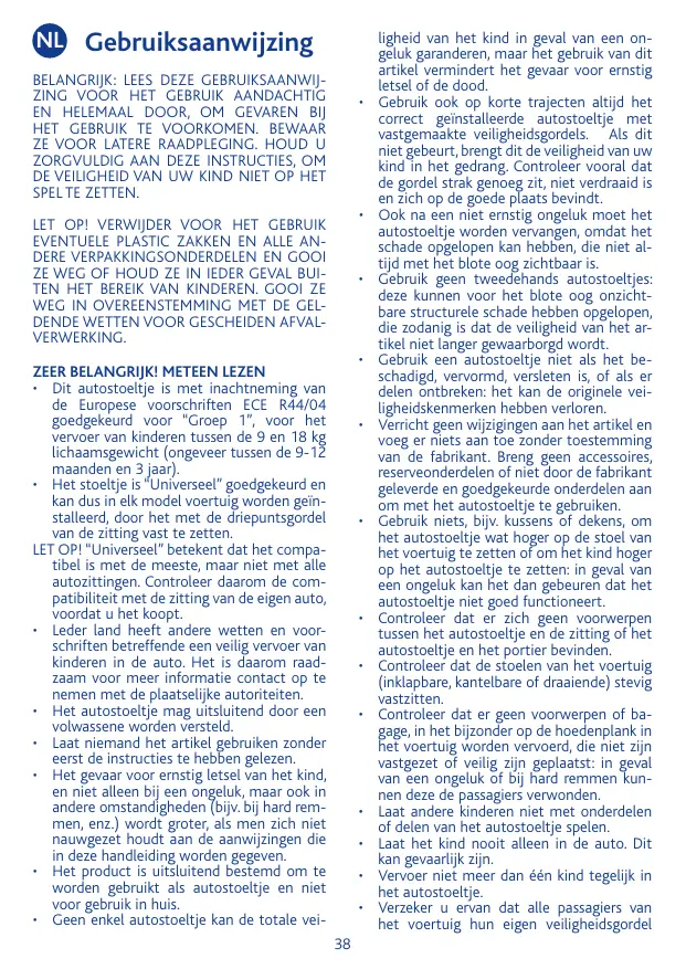 • Ce siège-auto est homologué “Universel” et peut donc être installé sur la quasi totalité des véhicules en l’accrochant à l’aide de la ceinture à trois points du siège de la voiture. ATTENTION ! “Universel” signifie qu’il est compatible avec la plupart des véhicules – ce qui ne signifie pas tous les véhicules. Il faut donc vérifier la compatibilité du siège-auto avec votre voiture avant l’achat. • Chaque pays a des lois et des règlements différents en matière de sécurité pour le transport des enfants en voiture. Par conséquent, il est conseillé de contacter les autorités locales pour plus d’informations. • Le réglage du siège-auto doit être fait uniquement par un adulte. • Ne pas utiliser ce produit sans avoir préalablement lu les instructions. • Le risque de dommages graves pour l’enfant augmente si les indications de cette notice ne sont pas suivies scrupuleusement. Ce risque n’intervient pas uniquement en cas d’accident, mais aussi dans d’autres situations (ex. freinages brusques, etc.). • Le produit est exclusivement destiné à