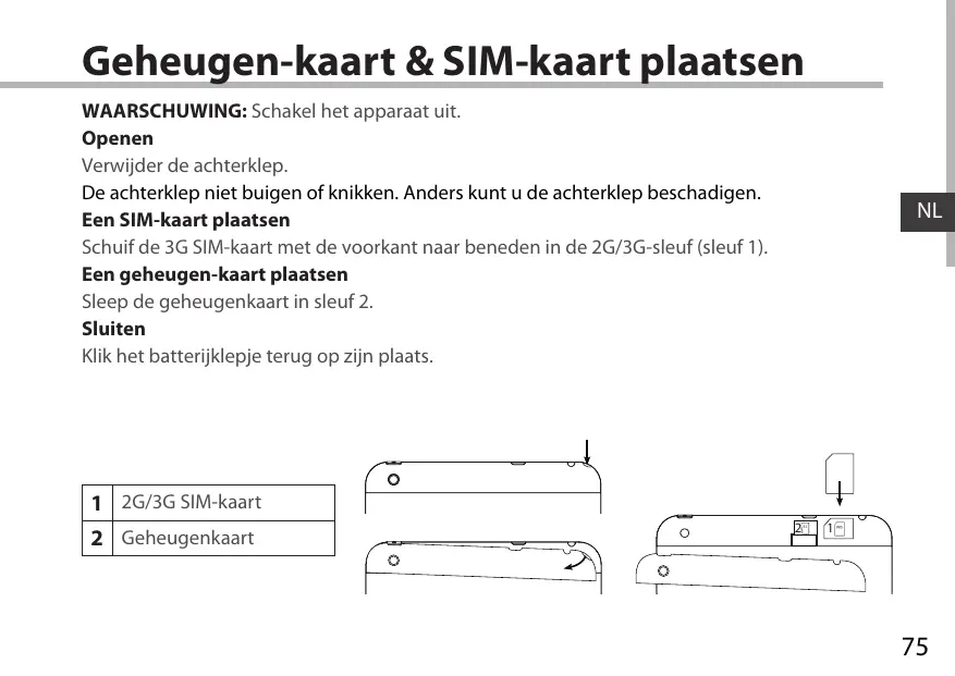 - Geheugen-kaart & SIM-kaart plaatsen p. 75