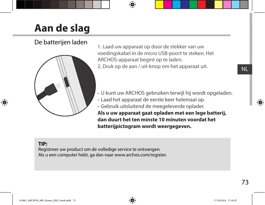 113065_ARCHOS_80b_Xenon_QSG_book.indd 15 -- Lors de la première utilisation, chargez complètement la batterie. -- Utilisez uniquement le chargeur fourni.