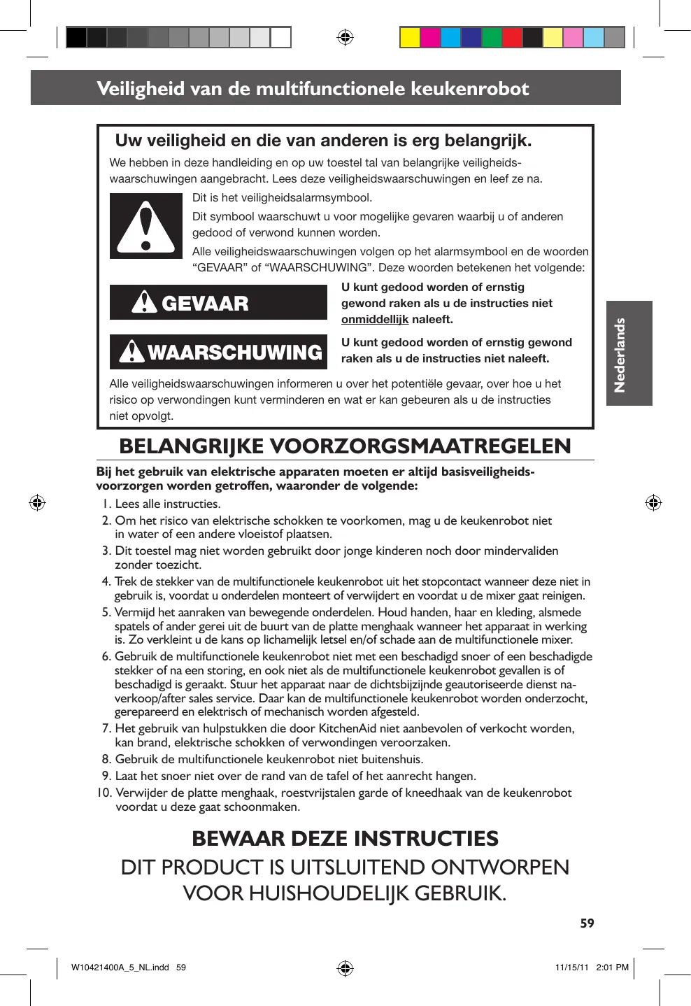 BEWAAR DEZE INSTRUCTIES DIT PRODUCT IS UITSLUITEND ONTWORPEN VOOR HUISHOUDELIJK GEBRUIK. 59 W10421400A_5_NL.indd 59