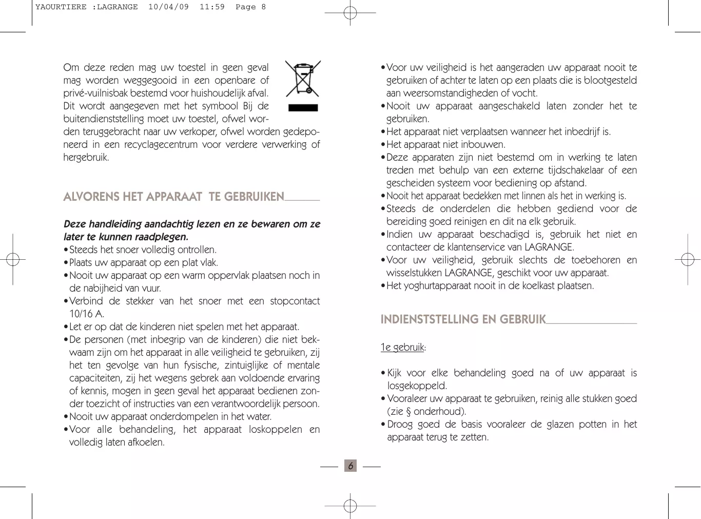 NED YAOURTIERE :LAGRANGE YAOURTIERE :LAGRANGE 10/04/09 11:59 Page 8 Om deze reden mag uw toestel in geen geval mag worden weggegooid in een openbare of privé-vuilnisbak bestemd voor huishoudelijk afval. Dit wordt aangegeven met het symbool Bij de buitendienststelling moet uw toestel, ofwel worden teruggebracht naar uw verkoper, ofwel worden gedeponeerd in een recyclagecentrum voor verdere verwerking of hergebruik.