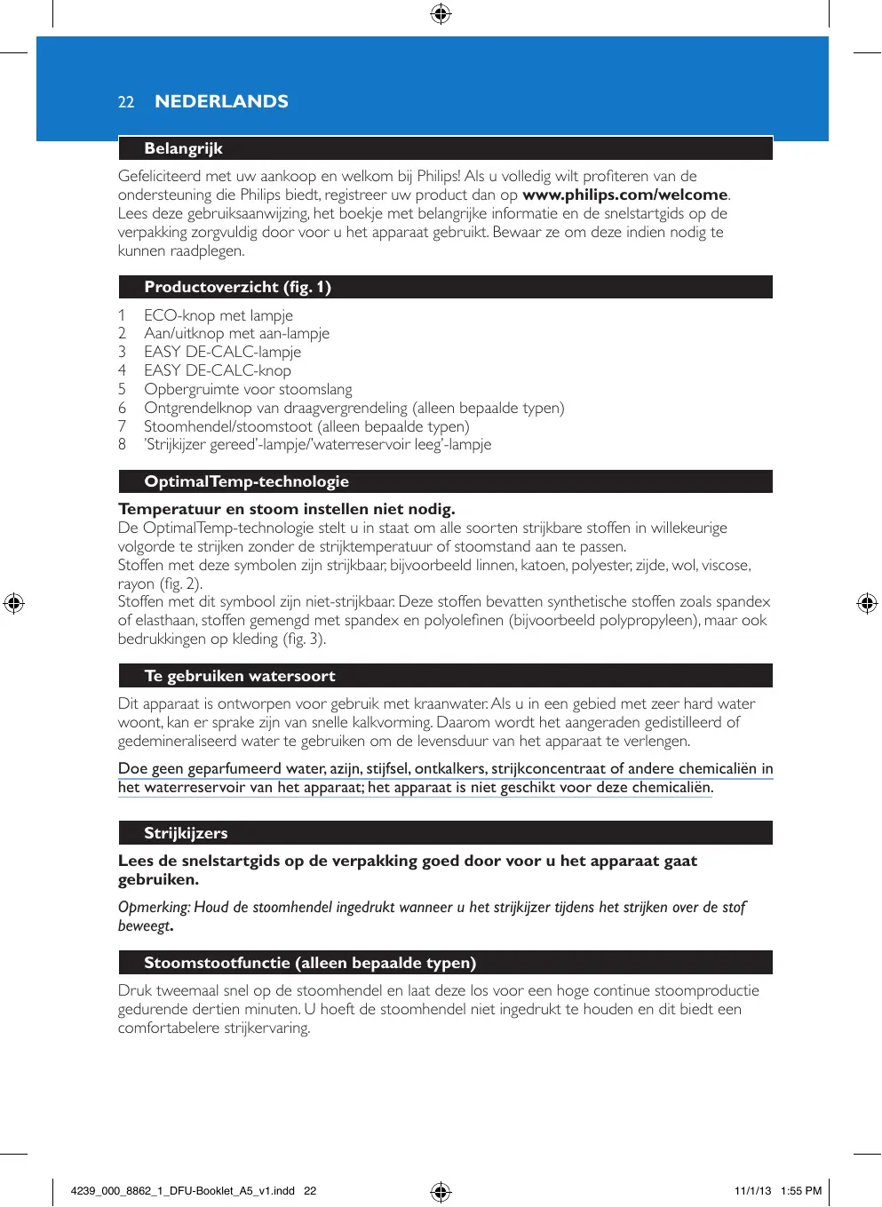 Gefeliciteerd met uw aankoop en welkom bij Philips! Als u volledig wilt profiteren van de ondersteuning die Philips biedt, registreer uw product dan op www.philips.com/welcome. Lees deze gebruiksaanwijzing, het boekje met belangrijke informatie en de snelstartgids op de verpakking zorgvuldig door voor u het apparaat gebruikt. Bewaar ze om deze indien nodig te kunnen raadplegen. Productoverzicht (fig. 1) 1 2 3 4 5 6 7 8