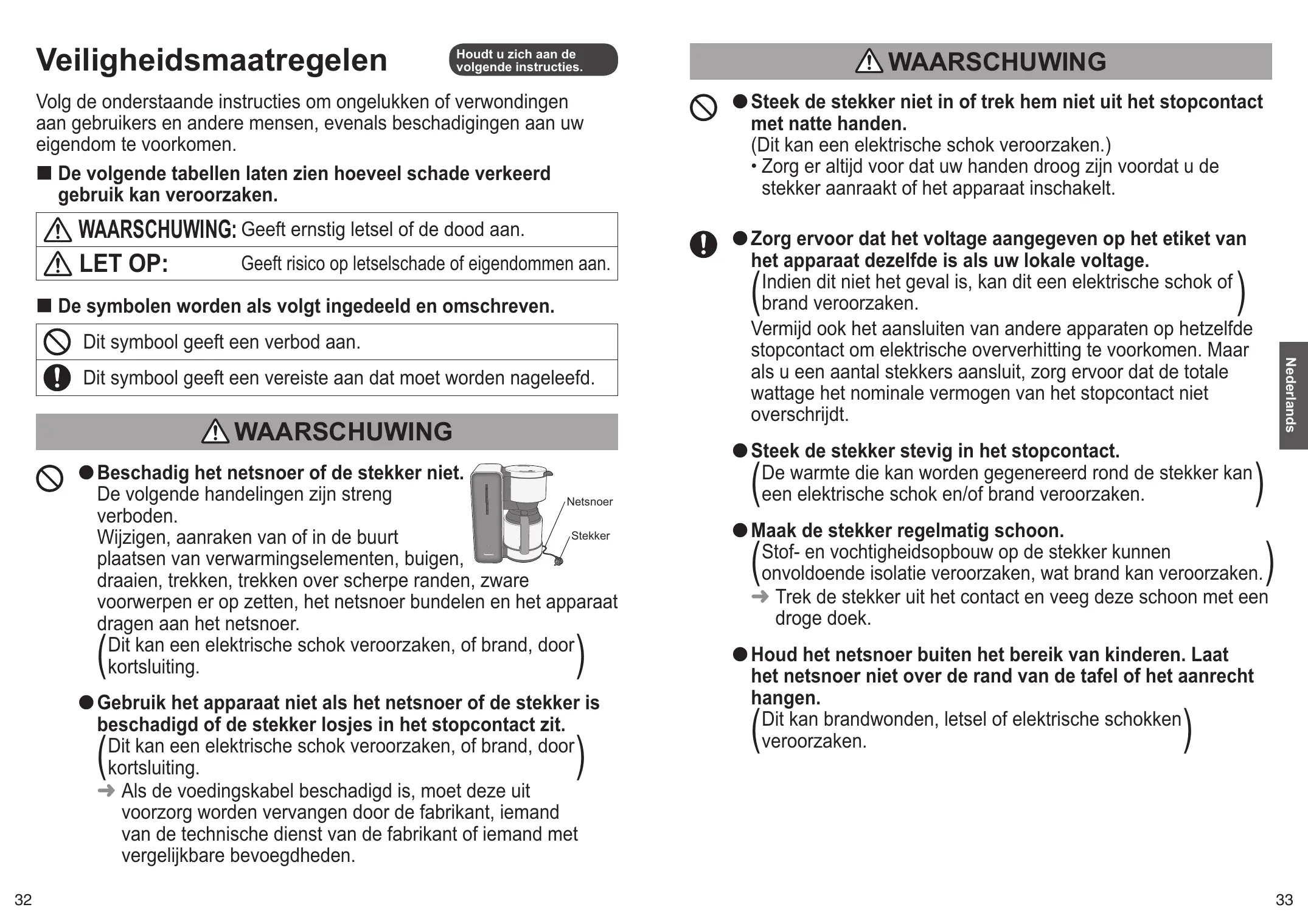 - Houd het netsnoer buiten het bereik van kinderen. Laat het netsnoer Niet over de rand van de tafel of het aanrecht hangen.
