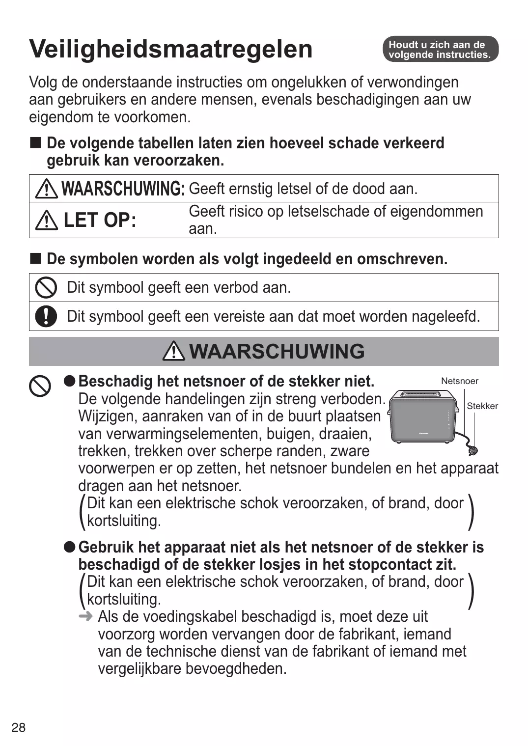 Als de voedingskabel beschadigd is,要去 deze uit voorzorg worden verrangen door de fabrikant, iemand van de technische Dienst van de fabrikant of iemand met vergelijkbare bevoegdheden.