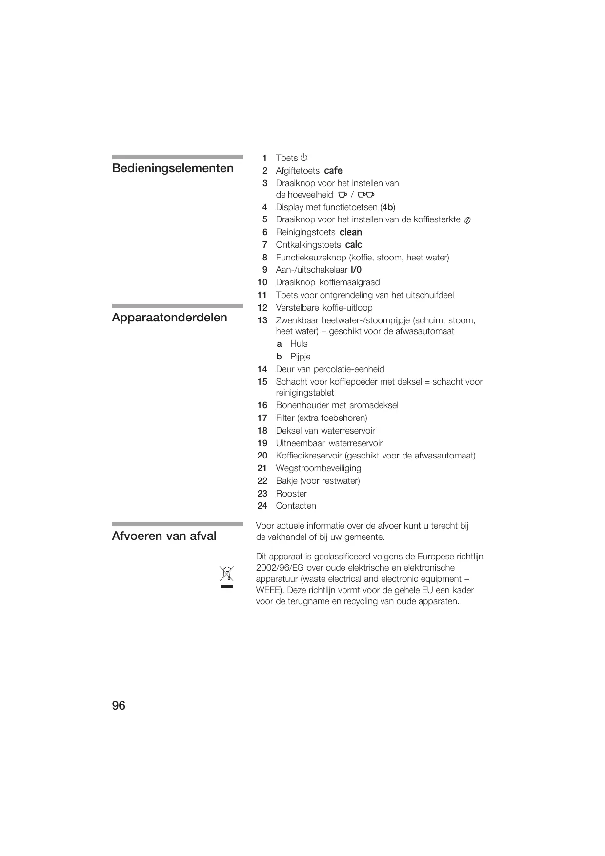 % 6oet :d #gitetoet :2 .aaiknop *oo het in tellen *an de:hoe*eelheid: x:(:w .i pla et unctietoet en ;< .aaiknop *oo het in tellen *an de koie tekte / ! 9einiging toet + # Ontkalking toet 4 . 5unctiekeuzeknop ;koie= too= heet wate< 5 #an'(uit chakelaa (& %& .aaiknop koieaalgaad %% 6oet *oo ontgendeling *an het uit chuideel % De telbae koie'uitloop % Fwenkbaa heetwate'( toopijpje ; chui= too= heet wate< ? ge chikt *oo de awa autoaat ,ul 1ijpje % .eu *an pecolatie'eenheid % chacht *oo koiepoede et dek el @ chacht *oo einiging tablet %! 8onenhoude et aoadek el %# 5ilte ;eIta toebehoen< %. .ek el *an watee e*oi %5 7itneebaa watee e*oi & )oiedike e*oi ;ge chikt *oo de awa autoaat< % 4eg toobe*eiliging 8akje ;*oo e twate< 9oo te Gontacten Doo actuele inoatie o*e de a*oe kunt u teecht bij de:*akhandel o bij uw geeente .it appaaat i gecla iiceed *olgen de &uope e ichtlijn 0%%0(B"(&G o*e oude elekti che en elektoni che appaatuu ;wa te electical and electonic eCuipent ? 4&&&< .eze ichtlijn *ot *oo de gehele:&7 een kade *oo de teugnae en eccling *an oude appaaten