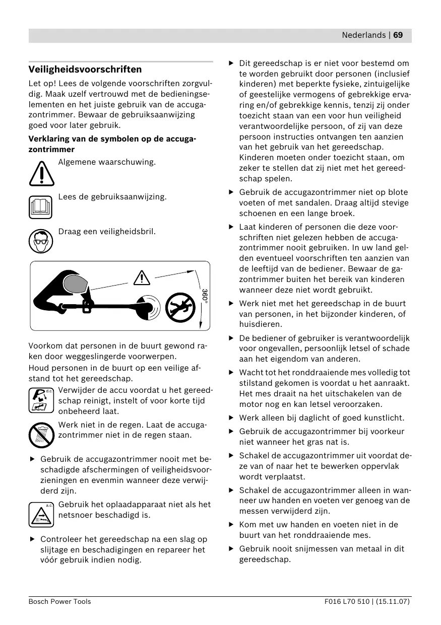 D-70745 Leinfelden-Echterdingen Voor uw veiligheid Schakel het gereedschap uit en verwijder de accu voordat u instel- of reinigingswerkzaamheden uitvoert. Na het uitschakelen van de accugazontrimmer loopt het snijmes nog enkele seconden uit. Druk op de accuontgrendelingsknop en trek de accu 15 naar achteren uit het gereedschap. Het opladen begint zodra de stekker van het oplaadapparaat in het stopcontact wordt gestoken en de accu vervolgens in het oplaadapparaat 14 wordt geplaatst. Plaats de accu 15 zoals in de afbeelding getoond eerst vooraan op het oplaadapparaat (n) en duw vervolgens de accu 15 achteraan omlaag (o). Als u de accu wilt verwijderen, gaat u in omgekeerde volgorde te werk. Door de intelligente oplaadmethode wordt de oplaadtoestand van de accu automatisch herkend en wordt de accu afhankelijk van de accutemperatuur en -spanning met de optimale laadstroom opgeladen. Voorzichtig! Raak het ronddraaiende snijmes niet aan. F016 L70 510 | (15.11.07) Bosch Power Tools Nederlands | 73 Daardoor wordt de accu ontzien en blijft deze, indien in het oplaadapparaat bewaard, altijd volledig opgeladen. Gereedschap monteren Zet de accu pas in de accugazontrimmer als deze volledig gemonteerd is. Opmerking: Het opladen is alleen mogelijk als de temperatuur van de accu zich binnen het toegestane oplaadtemperatuurbereik bevindt, zie het gedeelte „Technische gegevens”. Zorg ervoor dat de accugazontrimmer altijd in deze volgorde wordt gemonteerd: Knipperende accuoplaadindicatie 13 Plaats de beschermkap 11 op de trimmerkop 9. Het opladen wordt aangegeven door knipperen van de accuoplaadindicatie 13. Permanent verlichte accuoplaadindicatie 13 Montage van de beschermkap B nHaak de beschermkap vast aan de trimmerkop en duw deze naar achteren. oDruk de beschermkap omlaag tot deze stevig vastklikt. De permanent verlichte accuoplaadindicatie 13 geeft aan dat de accu volledig opgeladen is of dat de temperatuur van de accu buiten het toegestane temperatuurbereik ligt en daarom niet kan worden opgeladen. Zodra de temperatuur binnen het toegestane temperatuurbereik ligt, wordt de accu opgeladen. naar beneden en trek het naar buiten tot het vastklikt. Als de accu niet in het oplaadapparaat is gestoken, geeft de permanent verlichte accuoplaadindicatie 13 aan dat de netstekker in het stopcontact is gestoken en het oplaadapparaat gereed is voor gebruik. Ingebruikneming Aanwijzingen voor het opladen Bij langdurig opladen of meermaals opladen zonder onderbreking kan het oplaadapparaat warm worden. Dit is echter zonder bezwaar en wijst niet op een technisch defect van het oplaadapparaat. Een duidelijk kortere gebruiksduur na het opladen duidt erop dat de accu versleten is en moet worden vervangen. Snijschijf en mes monteren C Klik de snijschijf 16 op de aandrijfas. D Zet het mes 10 op de stift 17, druk het mes Gebruik Verwijder stenen, losse stukken hout en andere voorwerpen van het te knippen oppervlak. Na het uitschakelen van de accugazontrimmer loopt het snijmes nog enkele seconden uit. Wacht tot de motor en het snijmes stilstaan voordat u het gereedschap opnieuw inschakelt. Schakel het gereedschap niet kort achtereen uit en weer in. Accu plaatsen De lithiumionaccu is met „Electronic Cell Protection (ECP)” tegen te sterk ontladen beschermd. Als de accu leeg is, wordt het elektrische gereedschap door een veiligheidsschakeling uitgeschakeld: Het snijmes beweegt niet meer. Duw de accu zoals weergegeven in het gereedschap. De accu moet merkbaar vastklikken. f Druk na het automatisch uitschakelen van het gereedschap niet meer op de aan/uitschakelaar. De accu kan anders beschadigd worden. Laat de inschakelblokkering 2 los. Bosch Power Tools Inschakelen Druk op de inschakelblokkering 2 en bedien de aan/uit-schakelaar 1 in ingedrukte toestand. Uitschakelen Laat de aan/uit-schakelaar 1 los. F016 L70 510 | (15.11.07) 74 | Nederlands Opmerking: De motor start na het bedienen van de aan/uit-schakelaar 1 met een geringe vertraging. Gereedschap instellen Gebruik van de beweegbare greep E De beweegbare greep 5 kan in verschillende standen worden gezet: nAls u de stand wilt veranderen, draait u de greepschroef 4 los en verstelt u de beweegbare greep 5. oDraai de greepschroef 4 vast om de beweegbare greep 5 in de ingestelde stand vast te zetten. Trimmerlengte instellen F nDraai de klemhuls 6 90°. oAls u de geleidingsstang wilt verlengen, trekt u deze naar buiten. Als u de stang wilt inkorten, schuift u deze naar binnen. Draai de klemhuls 6 weer vast. Hoek van de trimmerkop instellen G Als u de kniphoek wilt veranderen, drukt u het voetpedaal 12 in en draait u de geleidingsstang 7 in de gewenste stand. Tips voor de werkzaamheden Bescherm de accu tegen hitte, bijvoorbeeld fel zonlicht, en vuur. Het gereedschap werkt niet onder 0 °C en niet boven 45 °C. Gras knippen J Verplaats de accugazontrimmer naar links en naar rechts en houd deze daarbij op voldoende afstand tot uw lichaam. De accugazontrimmer kan gras tot een hoogte van 15 cm efficiënt knippen. Knip hoger gras in verschillende stappen. Randen trimmen Geleid de accugazontrimmer langs de gazonranden. Voorkom contact met harde oppervlakken of muren om snel slijten van de draad te voorkomen. K Gebruik voor een betere sturing de boombe- schermbeugel 18 als geleidingshulp (toebehoren). Knippen rond bomen en struiken L Laat het voetpedaal 12 los. Knip voorzichtig rond bomen en struiken zodat deze niet in contact met de draad komen. Planten kunnen afsterven wanneer de schors beschadigd wordt. Instelling voor het knippen van randen K Gebruik voor een betere sturing de boombe- H Hoek van de trimmerkop instellen: schermbeugel 18 als geleidingshulp (toebehoren). nDruk het voetpedaal 12 in. oBreng de geleidingsstang 7 in de onderste stand. Laat het voetpedaal 12 weer los. I Trimmerkop verschuiven: nDraai de klemhuls 6 los. oDraai de geleidingsstang 7 90° om de trimmerkop 9 zoals getoond in te stellen voor het knippen van gras of het knippen van randen. Draai de klemhuls 6 w