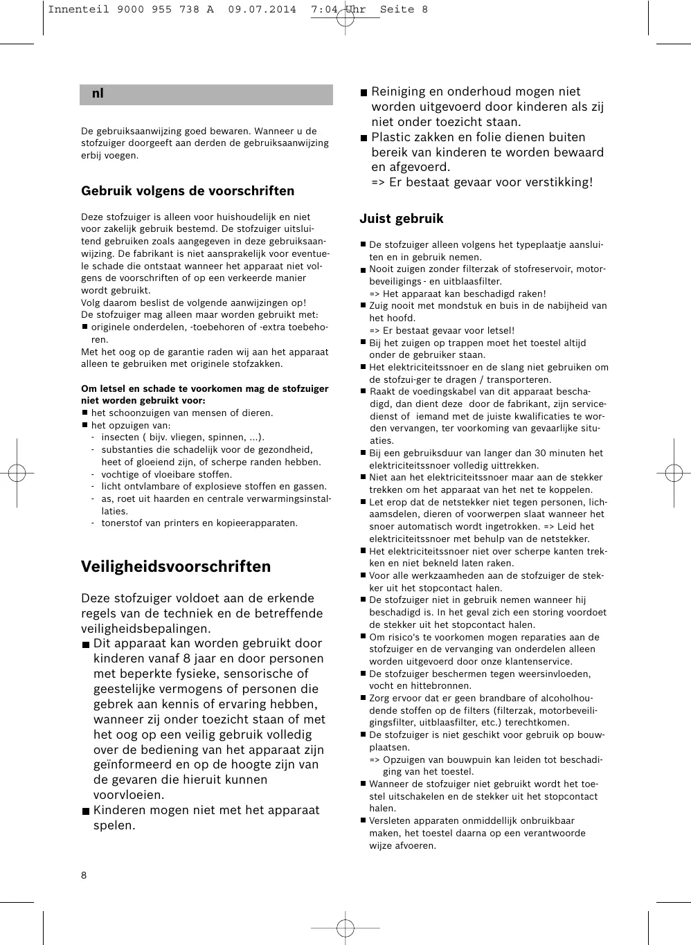 Seite 8 Reiniging en onderhoud mogen niet worden uitgevoerd door kinderen als zij niet onder toezicht staan. Plastic zakken en folie dienen buiten bereik van kinderen te worden bewaard en afgevoerd. => Er bestaat gevaar voor verstikking! Juist gebruik De stofzuiger alleen volgens het typeplaatje aansluiten en in gebruik nemen. Nooit zuigen zonder filterzak of stofreservoir, motorbeveiligings - en uitblaasfilter. => Het apparaat kan beschadigd raken! Zuig nooit met mondstuk en buis in de nabijheid van het hoofd. => Er bestaat gevaar voor letsel! Bij het zuigen op trappen moet het toestel altijd onder de gebruiker staan. Het elektriciteitssnoer en de slang niet gebruiken om de stofzui-ger te dragen / transporteren. Raakt de voedingskabel van dit apparaat beschadigd, dan dient deze door de fabrikant, zijn servicedienst of iemand met de juiste kwalificaties te worden vervangen, ter voorkoming van gevaarlijke situaties. Bij een gebruiksduur van langer dan 30 minuten het elektriciteitssnoer volledig uittrekken. Niet aan het elektriciteitssnoer maar aan de stekker trekken om het apparaat van het net te koppelen. Let erop dat de netstekker niet tegen personen, lichaamsdelen, dieren of voorwerpen slaat wanneer het snoer automatisch wordt ingetrokken. => Leid het elektriciteitssnoer met behulp van de netstekker. Het elektriciteitssnoer niet over scherpe kanten trekken en niet bekneld laten raken. Voor alle werkzaamheden aan de stofzuiger de stekker uit het stopcontact halen. De stofzuiger niet in gebruik nemen wanneer hij beschadigd is. In het geval zich een storing voordoet de stekker uit het stopcontact halen. Om risico's te voorkomen mogen reparaties aan de stofzuiger en de vervanging van onderdelen alleen worden uitgevoerd door onze klantenservice. De stofzuiger beschermen tegen weersinvloeden, vocht en hittebronnen. Zorg ervoor dat er geen brandbare of alcoholhoudende stoffen op de filters (filterzak, motorbeveiligingsfilter, uitblaasfilter, etc.) terechtkomen. De stofzuiger is niet geschikt voor gebruik op bouwplaatsen. => Opzuigen van bouwpuin kan leiden tot beschadiging van het toestel. Wanneer de stofzuiger niet gebruikt wordt het toestel uitschakelen en de stekker uit het stopcontact halen. Versleten apparaten onmiddellijk onbruikbaar maken, het toestel daarna op een verantwoorde wijze afvoeren. Innenteil 9000 955 738 A