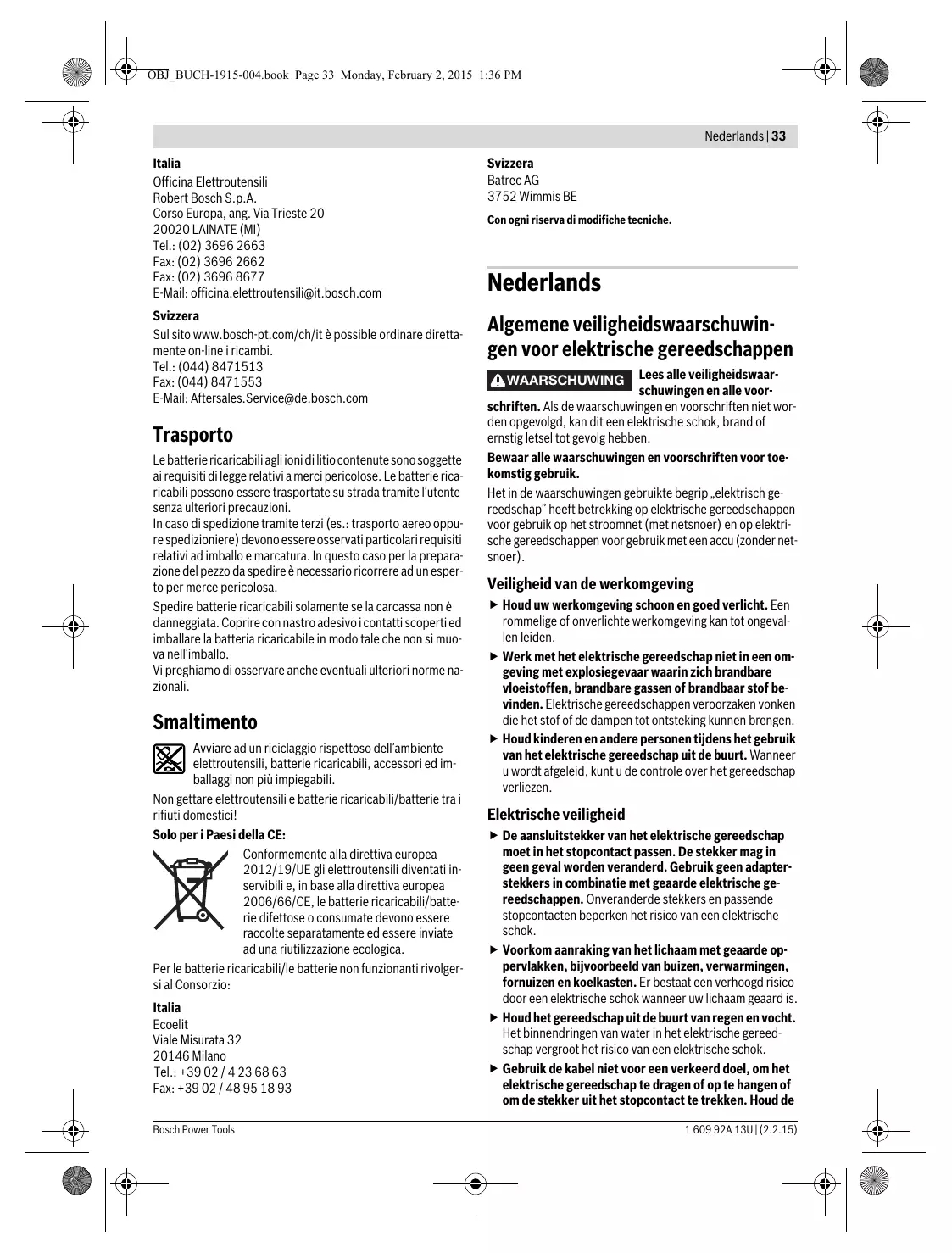 Informazioni sulla rumorosità e sulla vibrazione I valori di misura del prodotto sono indicati nella tabella a pagina 71. Valori di emissione acustica rilevati conformemente a EN 60745-2-1. Valori complessivi di oscillazione ah (somma vettoriale delle tre direzioni) e incertezza della misura K misurati conformemente alla norma EN 60745. Il livello di vibrazioni indicato nelle presenti istruzioni è stato rilevato seguendo una procedura di misurazione conforme alla norma EN 60745 e può essere utilizzato per confrontare gli 1 609 92A 13U | (2.2.15) Il servizio di assistenza risponde alle Vostre domande relative alla riparazione ed alla manutenzione del Vostro prodotto nonché concernenti le parti di ricambio. Disegni in vista esplosa ed informazioni relative alle parti di ricambio sono consultabili anche sul sito: www.bosch-pt.com Il team Bosch che si occupa della consulenza impieghi vi aiuterà in caso di domande relative ai nostri prodotti ed ai loro accessori. In caso di richieste o di ordinazione di pezzi di ricambio, comunicare sempre il codice prodotto a 10 cifre riportato sulla targhetta di fabbricazione dell’elettroutensile! Bosch Power Tools OBJ_BUCH-1915-004.book Page 33 Monday, February 2, 2015 1:36 PM Nederlands | 33 Italia Officina Elettroutensili Robert Bosch S.p.A. Corso Europa, ang. Via Trieste 20 20020 LAINATE (MI) Tel.: (02) 3696 2663 Fax: (02) 3696 2662 Fax: (02) 3696 8677 E-Mail: officina.elettroutensili@it.bosch.com Svizzera Sul sito www.bosch-pt.com/ch/it è possible ordinare direttamente on-line i ricambi. Tel.: (044) 8471513 Fax: (044) 8471553 E-Mail: Aftersales.Service@de.bosch.com Trasporto Le batterie ricaricabili agli ioni di litio contenute sono soggette ai requisiti di legge relativi a merci pericolose. Le batterie ricaricabili possono essere trasportate su strada tramite l’utente senza ulteriori precauzioni. In caso di spedizione tramite terzi (es.: trasporto aereo oppure spedizioniere) devono essere osservati particolari requisiti relativi ad imballo e marcatura. In questo caso per la preparazione del pezzo da spedire è necessario ricorrere ad un esperto per merce pericolosa. Spedire batterie ricaricabili solamente se la carcassa non è danneggiata. Coprire con nastro adesivo i contatti scoperti ed imballare la batteria ricaricabile in modo tale che non si muova nell’imballo. Vi preghiamo di osservare anche eventuali ulteriori norme nazionali. Smaltimento Avviare ad un riciclaggio rispettoso dell’ambiente elettroutensili, batterie ricaricabili, accessori ed imballaggi non più impiegabili. Non gettare elettroutensili e batterie ricaricabili/batterie tra i rifiuti domestici! Solo per i Paesi della CE: Conformemente alla direttiva europea 2012/19/UE gli elettroutensili diventati inservibili e, in base alla direttiva europea 2006/66/CE, le batterie ricaricabili/batterie difettose o consumate devono essere raccolte separatamente ed essere inviate ad una riutilizzazione ecologica. Per le batterie ricaricabili/le batterie non funzionanti rivolgersi al Consorzio: Italia Ecoelit Viale Misurata 32 20146 Milano Tel.: +39 02 / 4 23 68 63 Fax: +39 02 / 48 95 18 93 Bosch Power Tools Svizzera Batrec AG 3752 Wimmis BE Con ogni riserva di modifiche tecniche. Nederlands Algemene veiligheidswaarschuwingen voor elektrische gereedschappen Lees alle veiligheidswaarschuwingen en alle voorschriften. Als de waarschuwingen en voorschriften niet worden opgevolgd, kan dit een elektrische schok, brand of ernstig letsel tot gevolg hebben. Bewaar alle waarschuwingen en voorschriften voor toekomstig gebruik. Het in de waarschuwingen gebruikte begrip „elektrisch gereedschap” heeft betrekking op elektrische gereedschappen voor gebruik op het stroomnet (met netsnoer) en op elektrische gereedschappen voor gebruik met een accu (zonder netsnoer). WAARSCHUWING Veiligheid van de werkomgeving Houd uw werkomgeving schoon en goed verlicht. Een rommelige of onverlichte werkomgeving kan tot ongevallen leiden. Werk met het elektrische gereedschap niet in een omgeving met explosiegevaar waarin zich brandbare vloeistoffen, brandbare gassen of brandbaar stof bevinden. Elektrische gereedschappen veroorzaken vonken die het stof of de dampen tot ontsteking kunnen brengen. Houd kinderen en andere personen tijdens het gebruik van het elektrische gereedschap uit de buurt. Wanneer u wordt afgeleid, kunt u de controle over het gereedschap verliezen. Elektrische veiligheid De aansluitstekker van het elektrische gereedschap moet in het stopcontact passen. De stekker mag in geen geval worden veranderd. Gebruik geen adapterstekkers in combinatie met geaarde elektrische gereedschappen. Onveranderde stekkers en passende stopcontacten beperken het risico van een elektrische schok. Voorkom aanraking van het lichaam met geaarde oppervlakken, bijvoorbeeld van buizen, verwarmingen, fornuizen en koelkasten. Er bestaat een verhoogd risico door een elektrische schok wanneer uw lichaam geaard is. Houd het gereedschap uit de buurt van regen en vocht. Het binnendringen van water in het elektrische gereedschap vergroot het risico van een elektrische schok. Gebruik de kabel niet voor een verkeerd doel, om het elektrische gereedschap te dragen of op te hangen of om de stekker uit het stopcontact te trekken. Houd de 1 609 92A 13U | (2.2.15) OBJ_BUCH-1915-004.book Page 34 Monday, February 2, 2015 1:36 PM 34 | Nederlands kabel uit de buurt van hitte, olie, scherpe randen en bewegende gereedschapdelen. Beschadigde of in de war geraakte kabels vergroten het risico van een elektrische schok. Wanneer u buitenshuis met elektrisch gereedschap werkt, dient u alleen verlengkabels te gebruiken die voor gebruik buitenshuis zijn goedgekeurd. Het gebruik van een voor gebruik buitenshuis geschikte verlengkabel beperkt het risico van een elektrische schok. Als het gebruik van het elektrische gereedschap in een vochtige omgeving onvermijdelijk is, dient u een aardlekschakelaar te gebruiken. Het gebruik van een aardlekschakelaar vermind