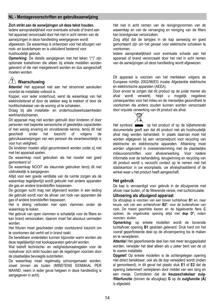 NL - Montagevoorschriften en gebruiksaanwijzing Zich strikt aan de aanwijzingen uit deze tekst houden. Iedere aansprakelijkheid voor eventuele schade of brand aan het apparaat veroorzaakt door het niet in acht nemen van de aanwijzingen in deze handleiding weergegeven wordt afgewezen. De wasemkap is ontworpen voor het afzuigen van rook- en kookdampen en is uitsluitend bestemd voor huishoudelijk gebruik. Opmerking: De details aangegeven met het teken “(*)” zijn optionele toebehoren die alleen bij enkele modellen worden geleverd of die niet meegeleverd worden en dus aangeschaft moeten worden. Het niet in acht nemen van de reinigingsnormen van de wasemkap en van de vervanging en reiniging van de filters kan brandgevaar veroorzaken. Zorg altijd dat de lampjes in de kap aanwezig en goed gemonteerd zijn om het gevaar voor elektrische schokken te voorkomen. Iedere aansprakelijkheid voor eventuele schade aan het apparaat of brand veroorzaakt door het niet in acht nemen van de aanwijzingen uit deze handleiding wordt afgewezen. Dit apparaat is voorzien van het merkteken volgens de Europese richtlijn 2002/96/EG inzake Afgedankte elektrische en elektronische apparaten (AEEA). Door ervoor te zorgen dat dit product op de juiste manier als afval wordt verwerkt, helpt u mogelijk negatieve consequenties voor het milieu en de menselijke gezondheid te voorkomen die anders zouden kunnen worden veroorzaakt door onjuiste verwerking van dit product als afval. Waarschuwing Attentie! Het apparaat niet aan het stroomnet aansluiten voordat de installatie voltooid is. Koppel, voor ieder onderhoud, eerst de wasemkap van het elektriciteitsnet af door de stekker weg te trekken of door de hoofdschakelaar van de woning uit te schakelen. Draag bij alle installatie- en onderhoudswerkzaamheden werkhandschoenen. Dit apparaat mag niet worden gebruikt door kinderen of door personen met beperkte sensorische of geestelijke capaciteiten of met weinig ervaring en onvoldoende kennis, tenzij dit niet geschiedt onder het toezicht of volgens de gebruiksaanwijzingen van een persoon die verantwoordelijk is voor hun veiligheid. De kinderen moeten altijd gecontroleerd worden zodat zij niet met het apparaat spelen. De wasemkap nooit gebruiken als het rooster niet goed gemonteerd is! De wasemkap NOOIT als steunvlak gebruiken tenzij dit niet uitdrukkelijk is aangegeven. Altijd voor een goede ventilatie van de ruimte zorgen als de wasemkap tegelijkertijd wordt gebruikt met andere apparaten die gas en andere brandstoffen toepassen. De gezogen lucht mag niet afgevoerd worden in een leiding die gebruikt wordt voor de afvoer van rook van apparaten die gas of andere brandstoffen toepassen. Het is streng verboden met open vlammen onder de wasemkap te koken. Het gebruik van open vlammen is schadelijk voor de filters en kan brand veroorzaken, daarom moet het absoluut vermeden worden. Het frituren moet geschieden onder voortdurend toezicht om te voorkomen dat verhit vet in brand raakt. De bereikbare onderdelen kunnen bijzonder warm worden als deze tegelijkertijd met kookapparaten gebruikt worden. Wat betreft technische- en veiligheidsmaatregelen voor de rookafvoer zich strikt houden aan de regelingen voorzien door de plaatselijke bevoegde autoriteiten. De wasemkap moet regelmatig schoongemaakt worden, zowel binnen als buiten (MINSTENS EENMAAL PER MAAND, neem in ieder geval hetgeen in deze handleiding is aangegeven in acht). op het product of op de bijbehorende Het symbool documentatie geeft aan dat dit product niet als huishoudelijk afval mag worden behandeld. In plaats daarvan moet het worden afgegeven bij een verzamelpunt voor recycling van elektrische en elektronische apparaten. Afdanking moet worden uitgevoerd in overeenstemming met de plaatselijke milieuvoorschriften voor afvalverwerking. Voor nadere informatie over de behandeling, terugwinning en recycling van dit product wordt u verzocht contact op te nemen met het stadskantoor in uw woonplaats, uw afvalophaaldienst of de winkel waar u het product heeft aangeschaft. Het gebruik De kap is vervaardigd voor gebruik in de afzuigversie met afvoer naar buiten, of de filtrerende versie, met luchtcirculatie. Uitvoering als afzuigend apparaat De afzuigkap is voorzien van een boven luchtafvoer B1 en, naar keuze, ook van een achterafvoer B2*, voor de buitenafvoer van rook. De meest geschikte kiezen en de bijgeleverde flens C opdoen, de ongebruikte opening altijd met dop D*, indien voorzien, sluiten. Opmerking: op enkele modellen wordt de bovenste luchtafvoer opening B1 gesloten geleverd: Druk hard om het vooraf geperforeerde deel op de afvoeropening los te maken en te verwijderen. Attentie! Het geperforeerde deel kan niet meer teruggeplaatst worden, verwijder het deel alleen als u zeker bent van de uit te voeren installatie. Opgelet! Op enkele modellen is de achtergelegen opening niet direct bereikbaar, ook als de dop verwijderd wordt (indien al gemonteerd), in dit geval het plastic stuk E1 of E2 dat de opening belemmert verwijderen door middel van een tang en een mesje. Controleren dat de keuzeschakelaar zuig/filterfunctie (binnen de afzuigkap) G op de zuigfunctie (A) is afgesteld.
