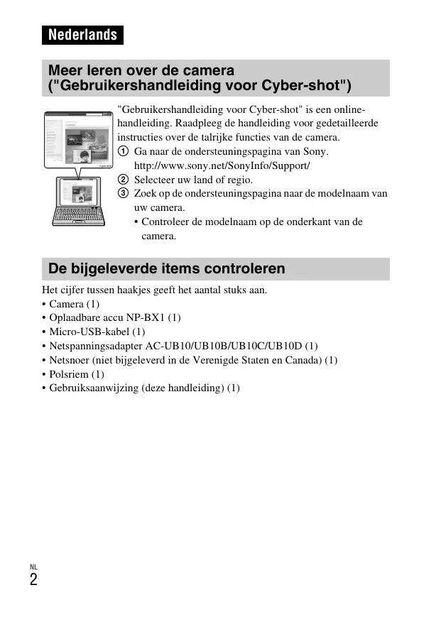 Nederlands Meer leren over de camera ("Gebruikershandleiding voor Cyber-shot") "Gebruikershandleiding voor Cyber-shot" is een onlinehandleiding. Raadpleeg de handleiding voor gedetailleerde instructies over de talrijke functies van de camera. 1 Ga naar de ondersteuningspagina van Sony. http://www.sony.net/SonyInfo/Support/ 2 Selecteer uw land of regio. 3 Zoek op de ondersteuningspagina naar de modelnaam van uw camera. • Controleer de modelnaam op de onderkant van de camera.