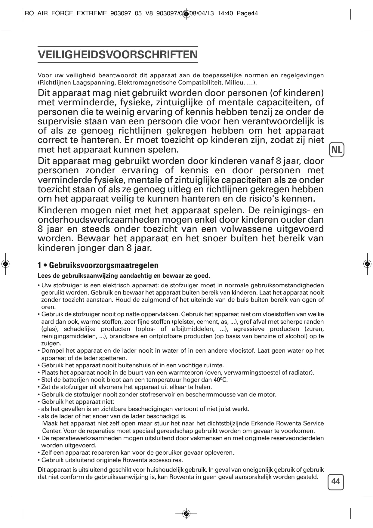 RO_AIR_FORCE_EXTREME_903097_05_V8_903097/05 08/04/13 14:40 Page44 VEILIGHEIDSVOORSCHRIFTEN Voor uw veiligheid beantwoordt dit apparaat aan de toepasselijke normen en regelgevingen (Richtlijnen Laagspanning, Elektromagnetische Compatibiliteit, Milieu, …). Dit apparaat mag niet gebruikt worden door personen (of kinderen) met verminderde, fysieke, zintuiglijke of mentale capaciteiten, of personen die te weinig ervaring of kennis hebben tenzij ze onder de supervisie staan van een persoon die voor hen verantwoordelijk is of als ze genoeg richtlijnen gekregen hebben om het apparaat correct te hanteren. Er moet toezicht op kinderen zijn, zodat zij niet met het apparaat kunnen spelen. Dit apparaat mag gebruikt worden door kinderen vanaf 8 jaar, door personen zonder ervaring of kennis en door personen met verminderde fysieke, mentale of zintuiglijke capaciteiten als ze onder toezicht staan of als ze genoeg uitleg en richtlijnen gekregen hebben om het apparaat veilig te kunnen hanteren en de risico's kennen. Kinderen mogen niet met het apparaat spelen. De reinigings- en onderhoudswerkzaamheden mogen enkel door kinderen ouder dan 8 jaar en steeds onder toezicht van een volwassene uitgevoerd worden. Bewaar het apparaat en het snoer buiten het bereik van kinderen jonger dan 8 jaar. 1 • Gebruiksvoorzorgsmaatregelen Lees de gebruiksaanwijzing aandachtig en bewaar ze goed.