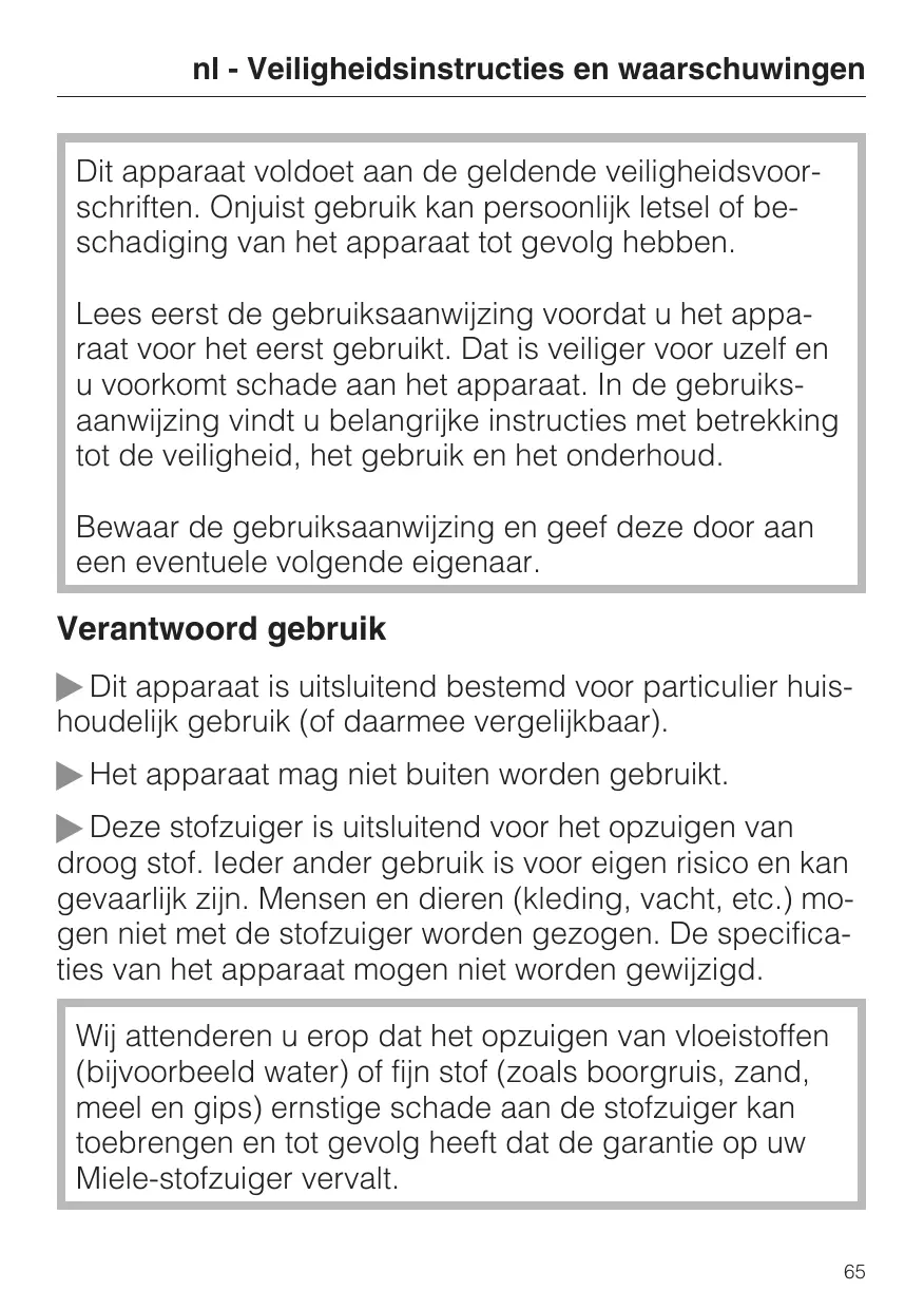 Deze stofzuiger is uitsluitend voor het opzuigen van droog stof. leder ander gebruik is voor eigener risico en kan gevaarlijk zijn. Menschen en dieren (kleding, vacht, etc.) mogen Niet met de stofzuiger worden gezogen. De specifica ties van het apparaat mogen Niet worden gewijzigd.