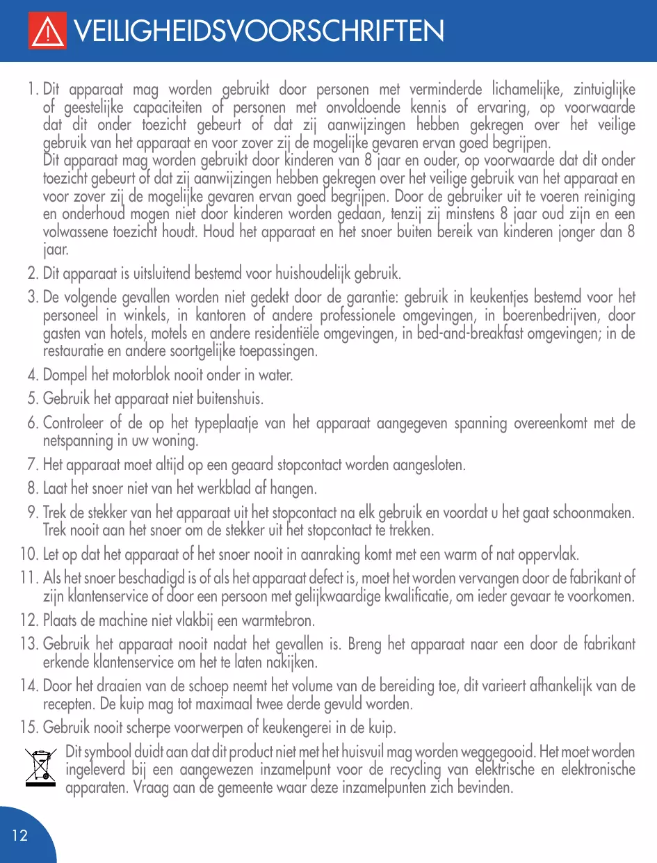 VEILIGHEIDSVOORSCHRIFTEN Dit apparaat mag worden gebruikt door personen met verminderde lichamelijke, zintuiglijke of geestelijke capaciteiten of personen met onvoldoende kennis of ervaring, op voorwaarde dat dit onder toezicht gebeurt of dat zij aanwijzingen hebben gekregen over het veilige gebruik van het apparaat en voor zover zij de mogelijke gevaren ervan goed begrijpen. Dit apparaat mag worden gebruikt door kinderen van 8 jaar en ouder, op voorwaarde dat dit onder toezicht gebeurt of dat zij aanwijzingen hebben gekregen over het veilige gebruik van het apparaat en voor zover zij de mogelijke gevaren ervan goed begrijpen. Door de gebruiker uit te voeren reiniging en onderhoud mogen niet door kinderen worden gedaan, tenzij zij minstens 8 jaar oud zijn en een volwassene toezicht houdt. Houd het apparaat en het snoer buiten bereik van kinderen jonger dan 8 jaar.