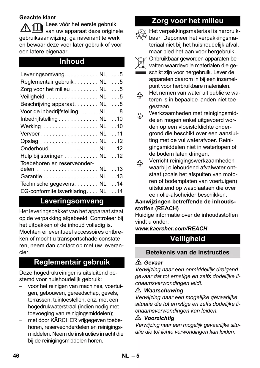 Leveringsomvang Het leveringspakket van het apparaat staat op de verpakking afgebeeld. Controleer bij het uitpakken of de inhoud volledig is. Mochten er eventueel accessoires ontbreken of mocht u transportschade constateren, neem dan contact op met uw leverancier. Reglementair gebruik Het verpakkingsmateriaal is herbruikbaar. Deponeer het verpakkingsmateriaal niet bij het huishoudelijk afval, maar bied het aan voor hergebruik. Onbruikbaar geworden apparaten bevatten waardevolle materialen die geschikt zijn voor hergebruik. Lever de apparaten daarom in bij een inzamelpunt voor herbruikbare materialen. Het nemen van water uit publieke wateren is in bepaalde landen niet toegestaan. Werkzaamheden met reinigingsmiddelen mogen enkel uitgevoerd worden op een vloeistofdichte ondergrond die beschikt over een aansluiting met de vuilwaterafvoer. Reinigingsmiddelen niet in waterlopen of de bodem laten dringen. Verricht reinigingswerkzaamheden waarbij oliehoudend afvalwater ontstaat (zoals het afspuiten van motoren of bodemplaten van voertuigen) uitsluitend op wasplaatsen die over een olie-afscheider beschikken. Aanwijzingen betreffende de inhoudsstoffen (REACH) Huidige informatie over de inhoudsstoffen vindt u onder: www.kaercher.com/REACH Veiligheid Betekenis van de instructies Gevaar Deze hogedrukreiniger is uitsluitend bestemd voor huishoudelijk gebruik: – voor het reinigen van machines, voertuigen, gebouwen, gereedschap, gevels, terrassen, tuintoestellen, enz. met een hogedrukwaterstraal (indien nodig met toevoeging van reinigingsmiddelen); – met door KÄRCHER vrijgegeven toebehoren, reserveonderdelen en reinigingsmiddelen. Neem de instructies in acht die bij de reinigingsmiddelen horen.