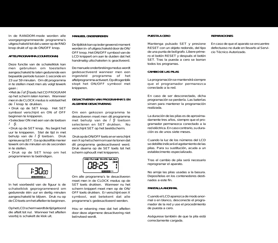 Wanneer op het LCD scherm abnormale aanduidingen verschijnen of wanneer het volledig blank blijft moet men het toestel uit het stopcontact trekken en een nulstelling (reset) uitvoeren. Vergewis u er ook van dat de batterij goed opgeladen werd. HERSTELLINGEN Aarzel niet het toestel naar een Erkende Technische Dienst te brengen wanneer het defect blijkt te zijn. In de RANDOM-mode worden alle voorgeprogrammeerde programma’s uitgeschakeld tot dat u weer op de RND knop drukt of op de ON/OFF knop. AFTELPROGRAMMA (COUNTDOWN) Deze functie van de schakelklok kan men gebruiken om toestellen aangeschakeld te laten gedurende een bepaalde periode tussen 1 seconde en 23 uur 59 minuten. Om dit programma in te stellen moet men als volgt tewerk gaan :