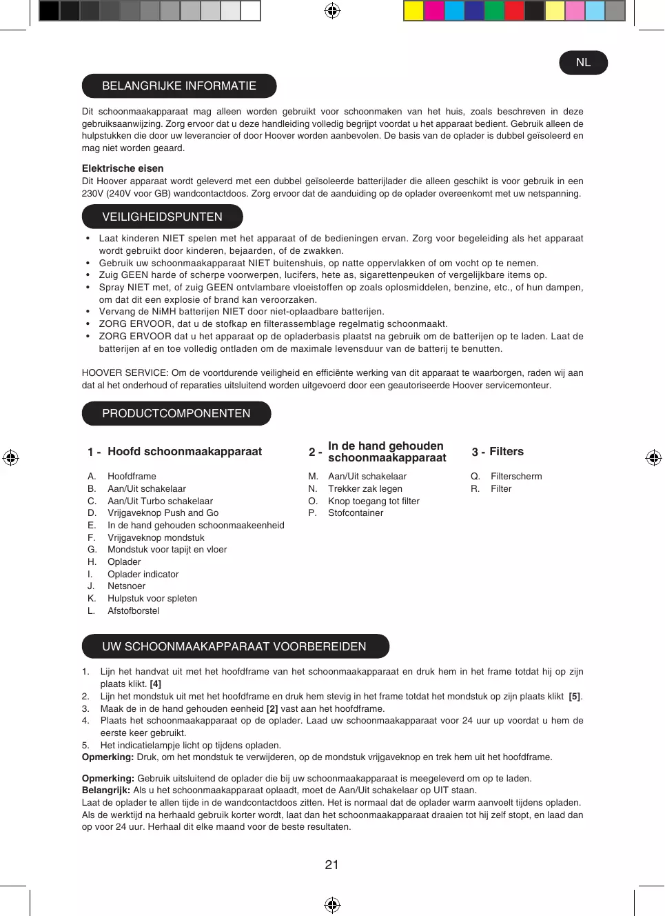 NL belangrijke informatie Dit schoonmaakapparaat mag alleen worden gebruikt voor schoonmaken van het huis, zoals beschreven in deze gebruiksaanwijzing. Zorg ervoor dat u deze handleiding volledig begrijpt voordat u het apparaat bedient. Gebruik alleen de hulpstukken die door uw leverancier of door Hoover worden aanbevolen. De basis van de oplader is dubbel geïsoleerd en mag niet worden geaard.