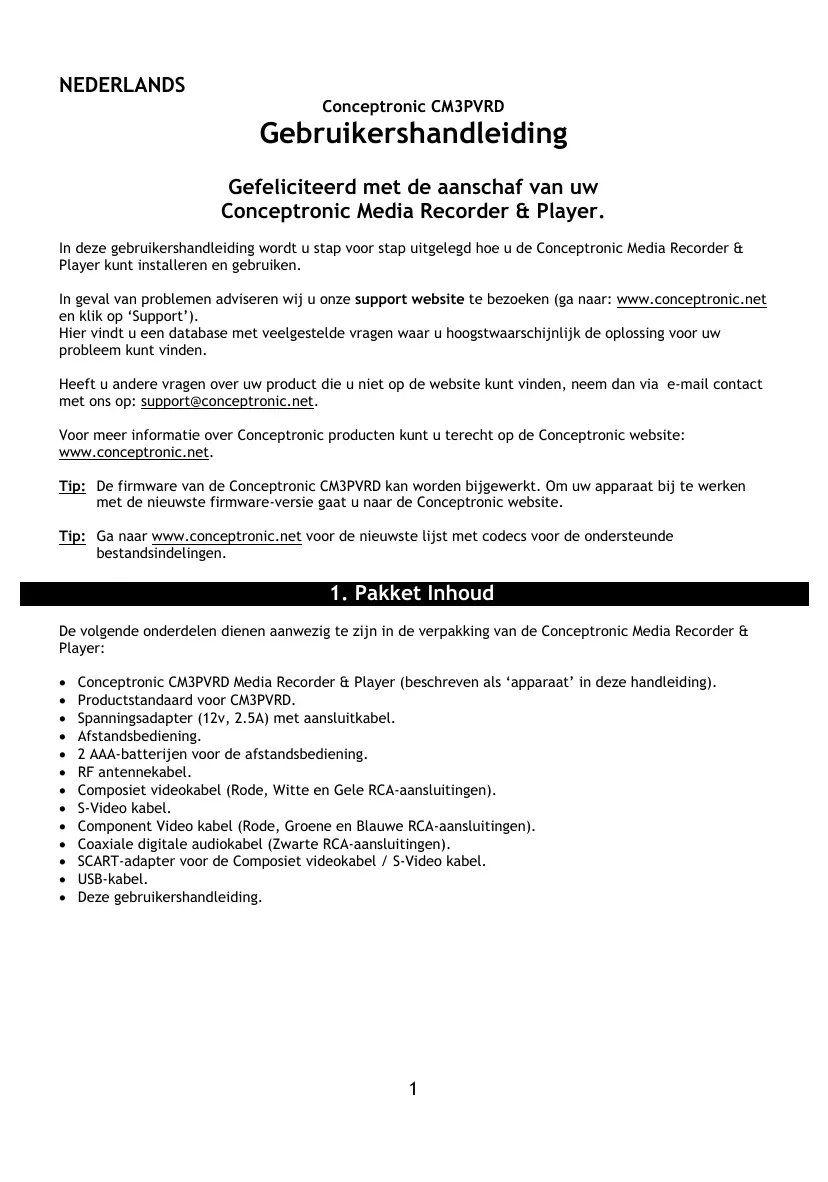 NEDERLANDS Conceptronic CM3PVRD Gebruikershandleiding Gefeliciteerd met de aanschaf van uw Conceptronic Media Recorder & Player. In deze gebruikershandleiding wordt u stap voor stap uitgelegd hoe u de Conceptronic Media Recorder & Player kunt installeren en gebruiken. In geval van problemen adviseren wij u onze support website te bezoeken (ga naar: www.conceptronic.net en klik op ‘Support’). Hier vindt u een database met veelgestelde vragen waar u hoogstwaarschijnlijk de oplossing voor uw probleem kunt vinden. Heeft u andere vragen over uw product die u niet op de website kunt vinden, neem dan via e-mail contact met ons op: support@conceptronic.net. Voor meer informatie over Conceptronic producten kunt u terecht op de Conceptronic website: www.conceptronic.net. Tip: De firmware van de Conceptronic CM3PVRD kan worden bijgewerkt. Om uw apparaat bij te werken met de nieuwste firmware-versie gaat u naar de Conceptronic website. Tip: Ga naar www.conceptronic.net voor de nieuwste lijst met codecs voor de ondersteunde bestandsindelingen.