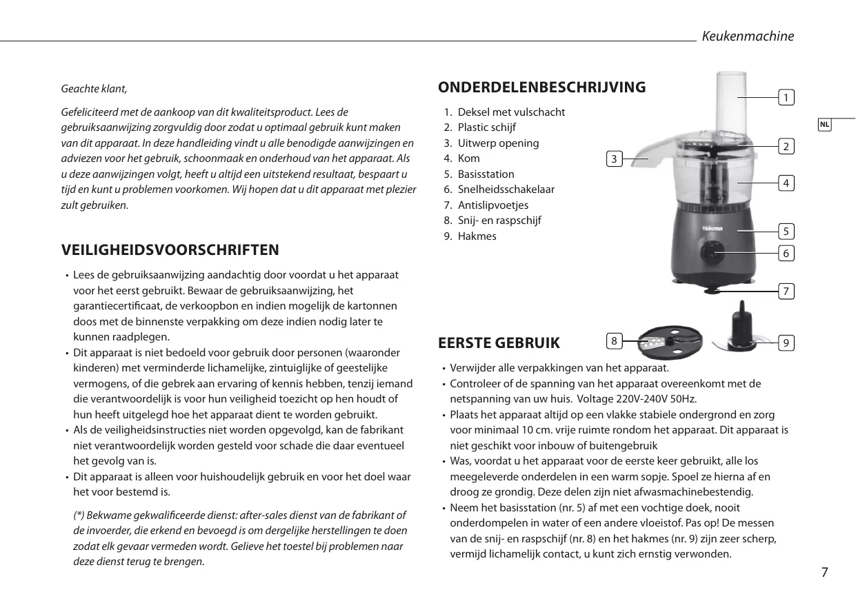 Keukenmachine Geachte klant, Gefeliciteerd met de aankoop van dit kwaliteitsproduct. Lees de gebruiksaanwijzing zorgvuldig door zodat u optimaal gebruik kunt maken van dit apparaat. In deze handleiding vindt u alle benodigde aanwijzingen en adviezen voor het gebruik, schoonmaak en onderhoud van het apparaat. Als u deze aanwijzingen volgt, heeft u altijd een uitstekend resultaat, bespaart u tijd en kunt u problemen voorkomen. Wij hopen dat u dit apparaat met plezier zult gebruiken. Veiligheidsvoorschriften